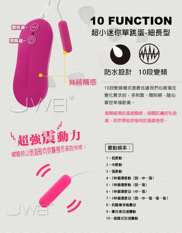 由APHRODISIA推出的Bullet Vibrator系列跳蛋, 使用安全ABS塑料材質,外層再施以PU塗屬層包覆,使得它的觸感柔細光滑舒適,各種大小不一的造蛋造型任君選擇,繽紛的色彩,搭配的控制器就連造型都不隨便,光滑流線型的造型設計感十足,操作超簡單的10段變頻震動頻率,讓所有女性朋友的性生活更精采更不一樣,享受快意人生就從它開始!
