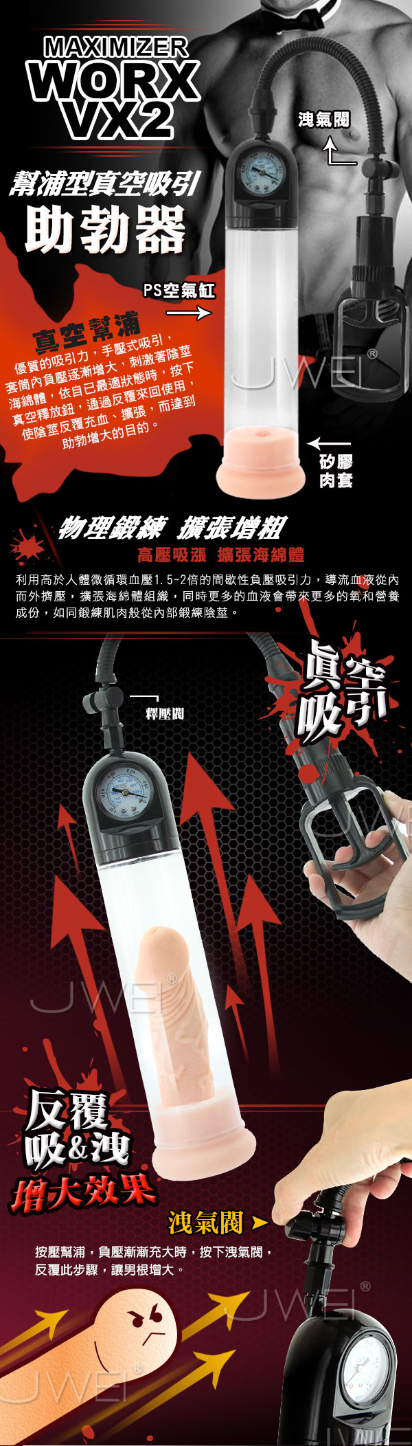 本商品旨在以純物理鍛練的方式鑄造健碩勇壯男人!延長男性勃起時間 自慰器集於一體,讓你目睹它慢慢變大!將組件連接好,將男根送入到套筒內,你就可以按壓氣囊讓其產生負壓吸力,整體刺激男性生殖器、改善男性生殖器勃起障礙、使男性生殖器勃起,可根據個人的情況,如感到負壓過強,你可輕輕按下專屬的快速排氣閥按鈕,即可以緩解下來,可將每次的數據都記錄下來,如此長期訓練下來,可改善生殖器勃起及延長射精時間,最終以提高性生活品質為目的。