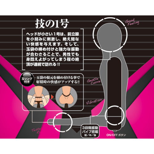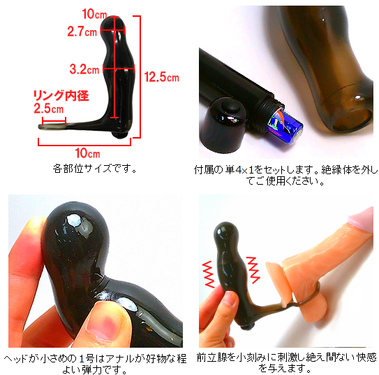 前立腺刺激を追求するアナルクローザーに、ローターがセットになった電動タイプが登場しました。こちらの「1号」は、前立腺を小刻みに刺激し絶え間ない快感を与え続けてくれます。さらに玉袋の締め付けと強力な振動が合わさることで、男性でも身悶えよがってしまう程の絶頂が連続で訪れるという優れもの。付属のローターは取り外しが可能となっていて、3段階の振動レベルをお楽しみいただけます。ON/OFFスイッチの簡単ワンボタンで初心者でも楽に操作可能。機能美と使いやすさを両立させたオススメのアナルアイテムです。