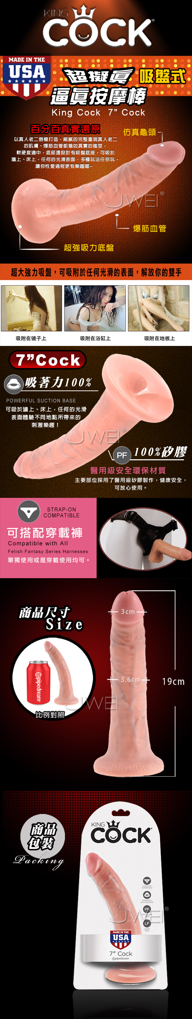 King Cock 男根之王系列,全系列都在美國生產製造,使用美國最先進的技術,採用頂級仿真膚質矽膠材質,以真人老二倒模打造,細膩的完整重現真人老二的肌膚、爆青筋的血管,都猶如真實的陰莖,就連軟硬度也與真人老二相差無比,擬真度在市面上的陽具按摩棒中絕對堪稱男根之王。