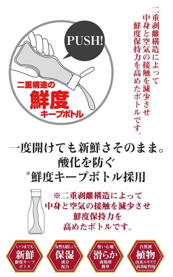 ボトル内部に施された二重剥離構造により、ローションと空気の接触を減少させ、鮮度保持力を高めたボトルです。