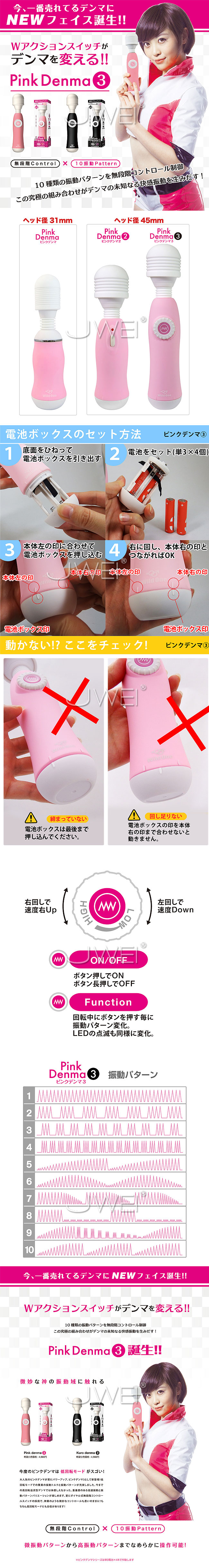 「絶対イカせるデンマ」の第3弾!1のパターン振動 2のヘッドサイズ 神の振動域で弱さと強さを極める!”絶対イカせるデンマ”の最高峰「クロデンマ3」誕生!!Wアクションスイッチがデンマの未来を変える!!10種類の振動パターンを無段階コントロール制御、この究極の組み合わせがデンマの未知なる快感振動を生みだす!新開発のWアクションスイッチ搭載!!最高の操作性を実現するため振動強度を自在に操るダイヤル式スイッチと、瞬時に振動パターンを切り替えられるボタンスイッチを融合させました。これによりデンマ通をも唸らせる神業のような微妙な振動コントロールがどなたでも簡単に行えます。