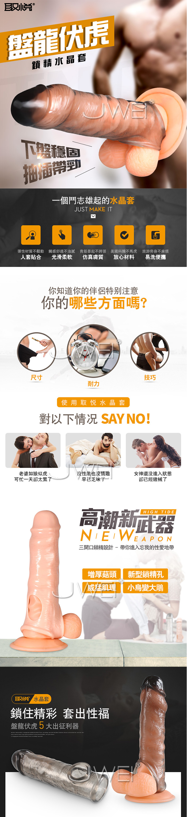 彈性材質不鬆動、人套貼合;觸感舒適不油膩,光滑柔軟、青筋爆起不誇張,仿真膚質;美國科騰不馬虎,安心材質;旅遊旁身不麻煩,易洗便攜!高潮新武器,三開口鎖精設計-帶你進入忘我的性愛地帶四大點:增厚菇頭、新型鎖精孔、威猛肌理、小鳥便大鵰。半實體菇頭:菇頭部分在頂端特設增厚尺寸,武裝起來偉岸又輕便!真可謂盔甲也能輕裝上陣。高擬真肌理:細膩而精緻的莖皮摺皺,加上爆起的青筋足以讓性福尖叫,這何止是視覺上的享受!鎖精新方式:包裹陰莖的新型鎖精構造,其寬舒鎖精帶讓蛋蛋也狂歡,穩固下盤抽插無顧慮也更帶勁!