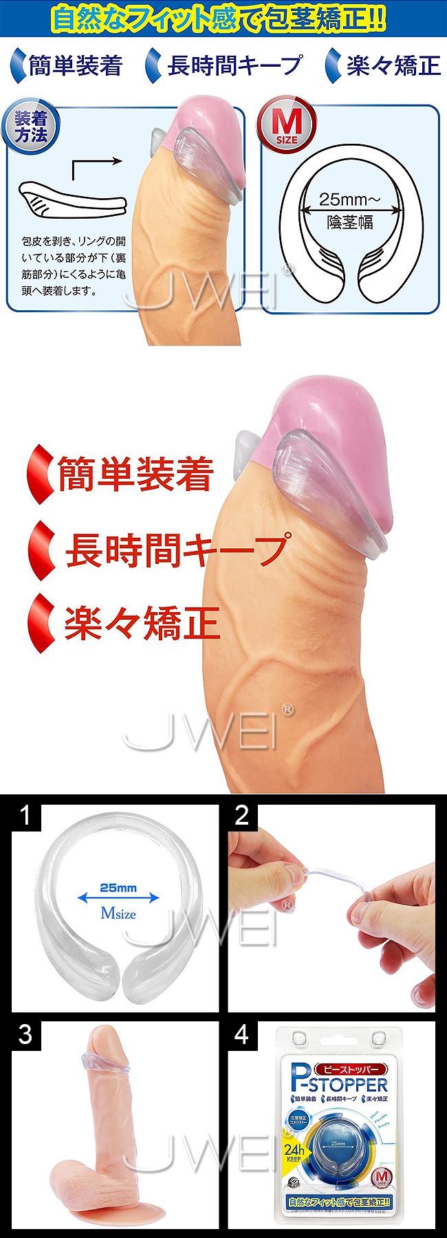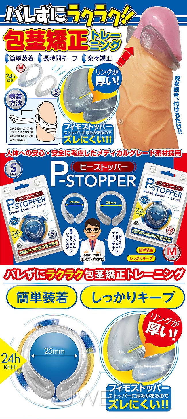 皮を剥きリングを付けるだけの簡単装着!!また、ストッパーに厚みがあるのでズレにくく、長時間キープを実現!!人体への影響に考慮したメディカルグレード素材を採用し、安心・安全に使用可能!! ■日本原裝進口,品質保證 ■内径25mm ■包茎矯正トレーニング ■簡単装着 ■24時間装着可能 ■メディカルグレード素材 注意:本商品非醫療器材且無醫學療效,若包莖問題嚴重時請至醫院求診。