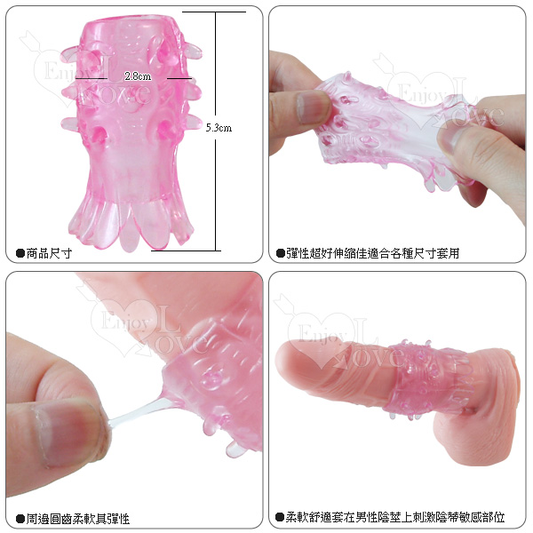 本款産品由高級超軟乳矽膠精製而成,材質使用加香材料。水晶套直徑3.5cm,長6cm。套體有突起的軟刺,柔軟而富有韌性,摩擦力度大;整件産品爲透明設計,使用時可給人的視覺以強烈的刺激。