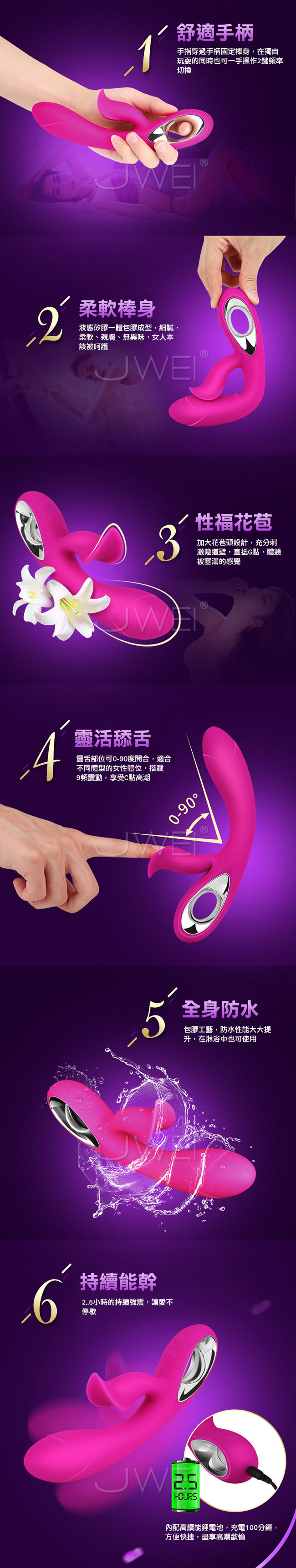 解放您的G點潮吹,就差一個G點棒!此款朵拉DARO採用液體親膚矽膠健康舒適,還原逼真觸感使用安心。棒身加大花苞頭設計,充分刺激陰道壁直抵G點,體驗被塞滿的快感。而靈舌部位可0-90度開合,適合不同體型的女性搭載9頻震動,享受C點高潮。採用全身防水包膠工藝使防水性大大提升在淋浴中也可使用。使用USB充電超強續航力讓強震不停歇盡享高潮歡愉。