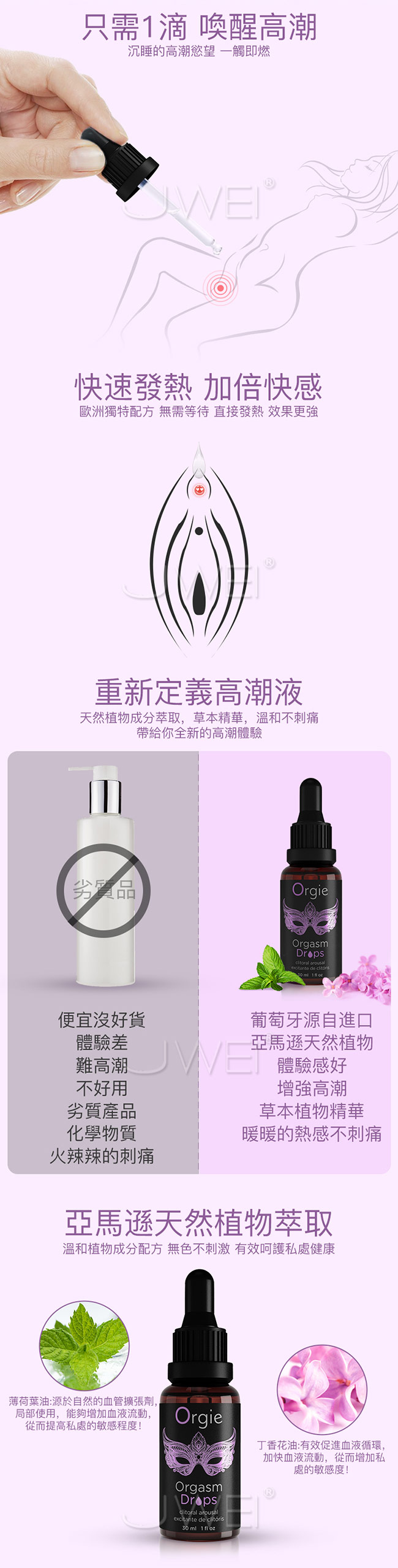 女性快感高潮液採自來於亞馬遜天然植物萃取物製成,親和皮膚無傷害,不刺激讓您使用更放心。只需一滴即能快速發熱無需等待,喚醒您沉睡的高潮欲望,一觸即燃。此款貼近女性愛液,保護女性私處盡情享受,採水潤基底無色素、無香精色澤透亮讓您更易清洗喔~