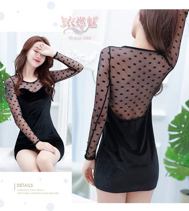 ►您現在的位置:首頁>曼妙女神!圓點透視網紗拼接曲線派對裝﹝絲絨黑﹞