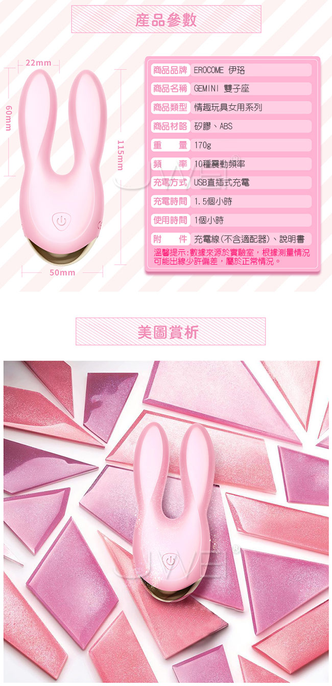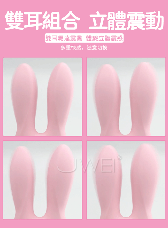 雙子座GEMINI強震雙耳萌兔跳蛋,可愛柔軟的兔耳角度可隨意彎折,哪裡敏感就刺激哪裡。雙耳內置馬達共10種震動頻率供您選擇,讓您享受到雙耳組合多重快感!而此款採用細膩親膚矽膠,柔軟不變形讓您安心使用不怕傷害嬌嫩的肌膚。且此款為防水靜音設計,讓您輕鬆清洗盡情享受性愛的美好呦~