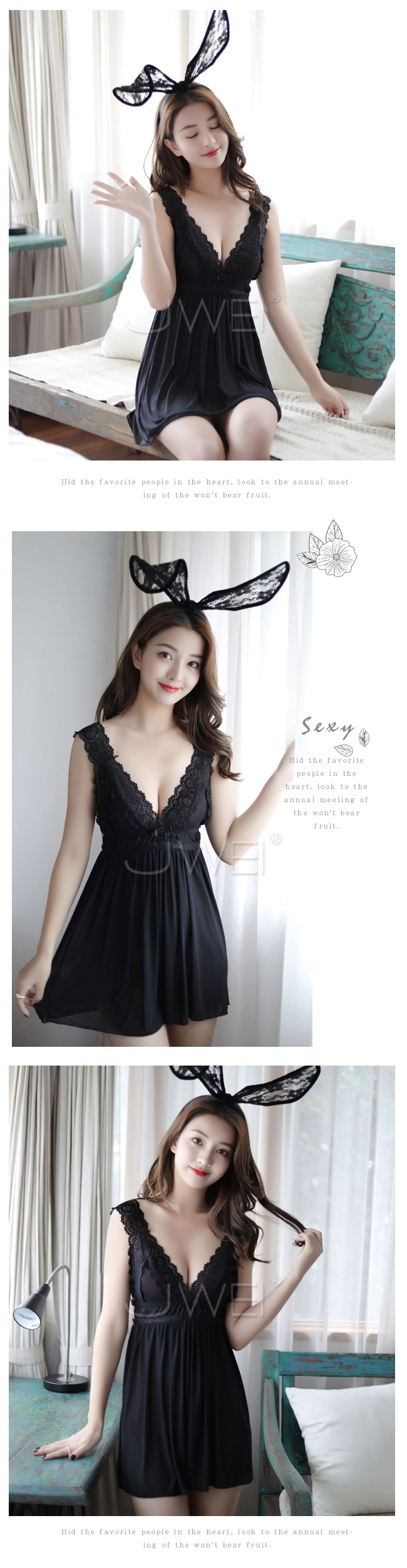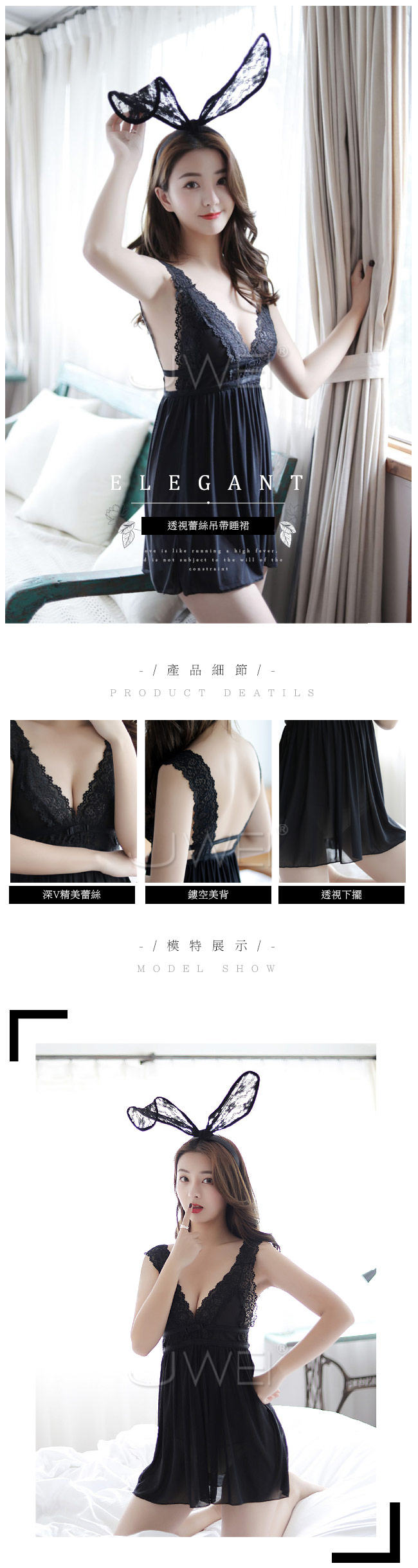 *╮今晚的美妙我充滿期待~╭* 胸前深V精美蕾絲微美展露, 鏤空美背秀出迷人小香肩, 透視美感讓身形若隱若現使他目眩神迷~