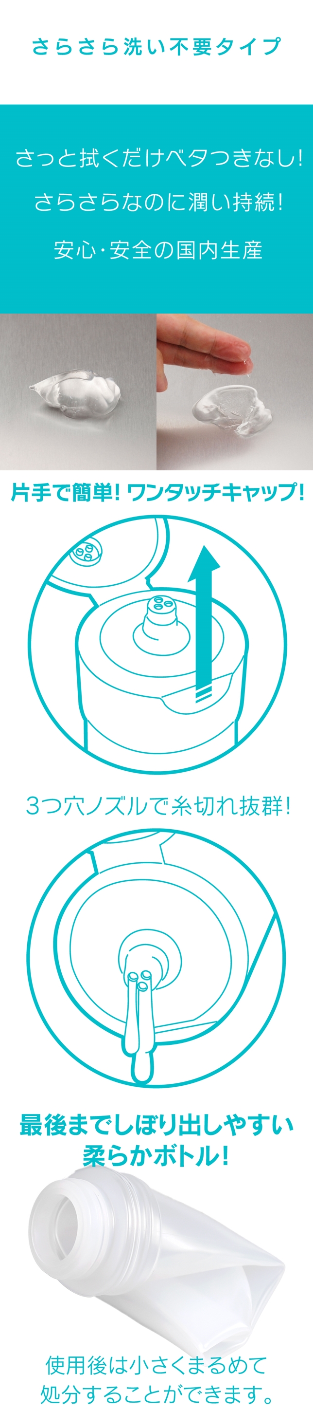 Ag+でエクセレントローションが新しく生まれ変わりました。銀イオン配合で消臭・抗菌・除菌もでき、より衛生的に使用できるようになりました。さらさら洗い不要タイプは、ティッシュでさっと拭くだけでベタつきがありません。また、特別な配合によりさらさらなのに潤いが持続します。容器も使いやすくなりました。ワンタッチキャップは片手で簡単に開閉できますので、プレイ途中の継ぎ足しなどにも便利です。3 つ穴ノズルで糸切れ抜群の構造になっています。柔らかボトルで最後まで絞り出せます。空になったボトルは丸めてコンパクトに捨てれます。安心・安全の国内生産です。