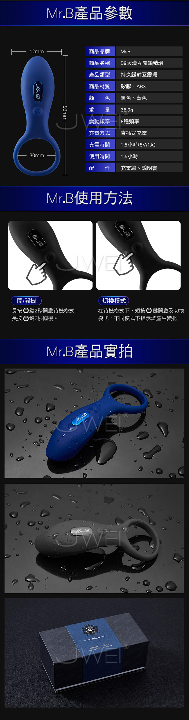 ■尺寸:大小詳如圖片標示 ■材質:矽膠、ABS ■電源:USB充電 ■特色:8段變頻、男女共震、持久緩射