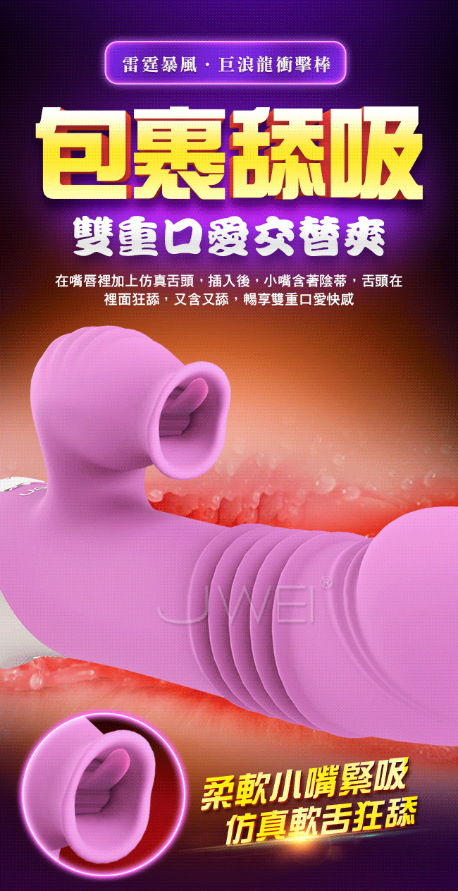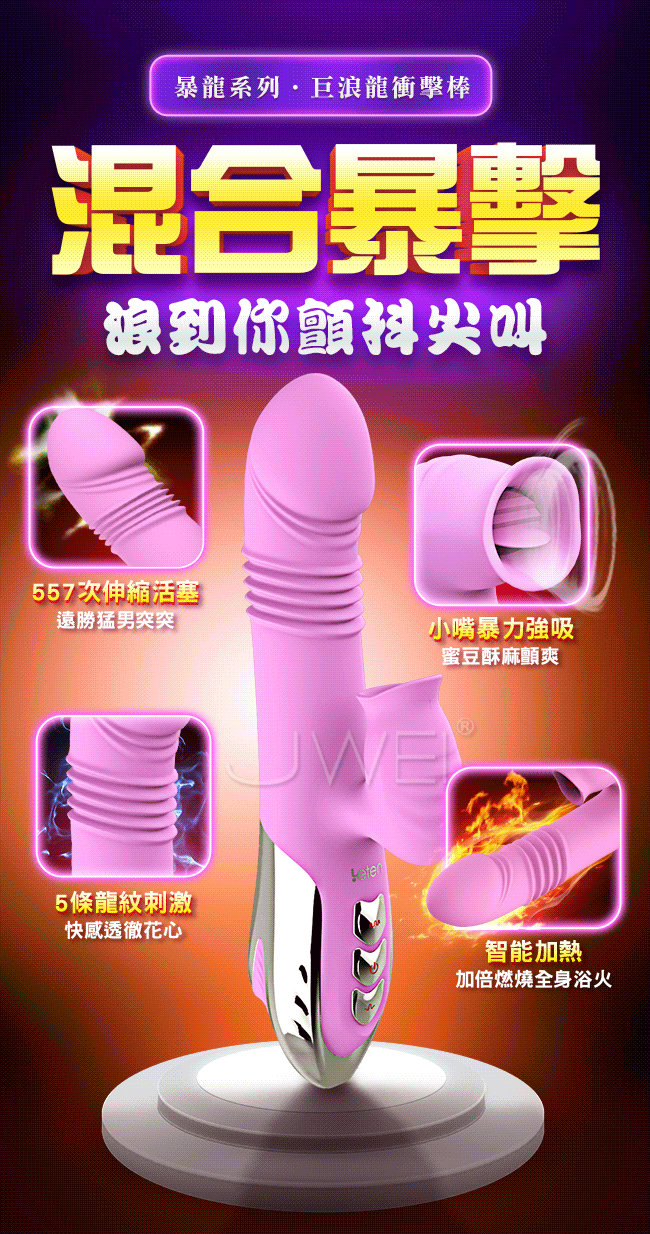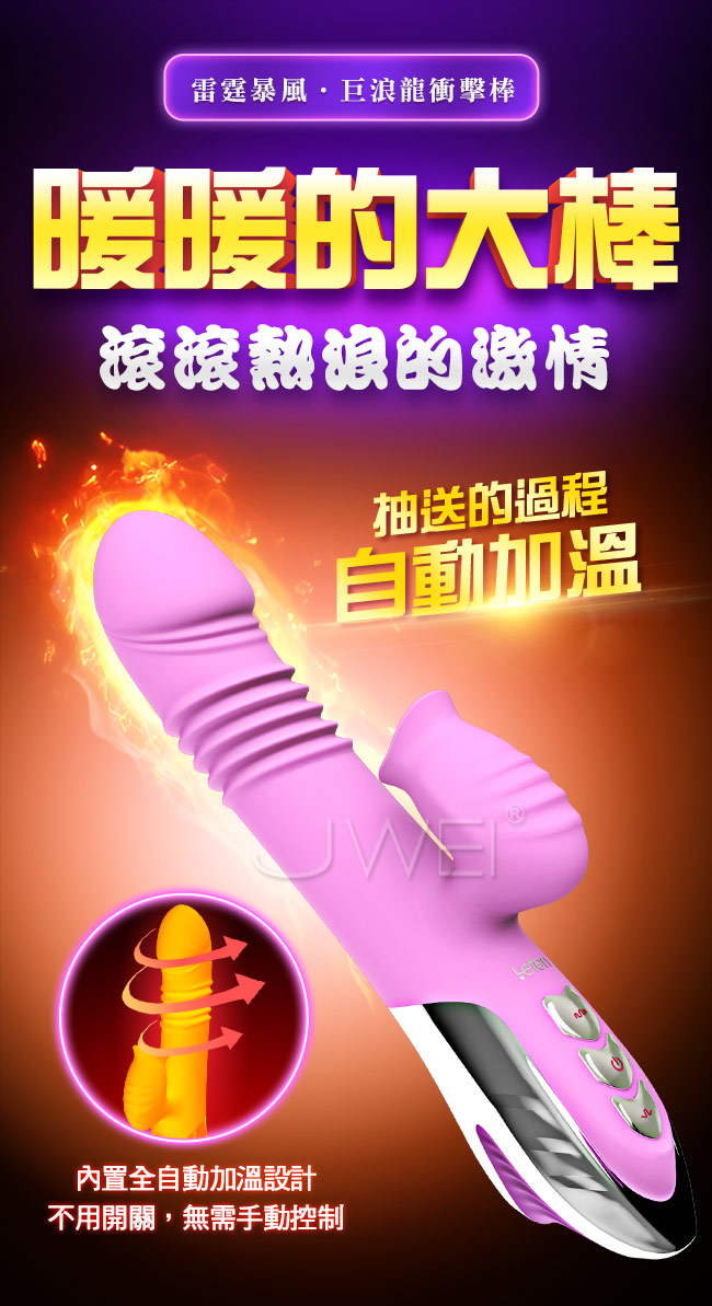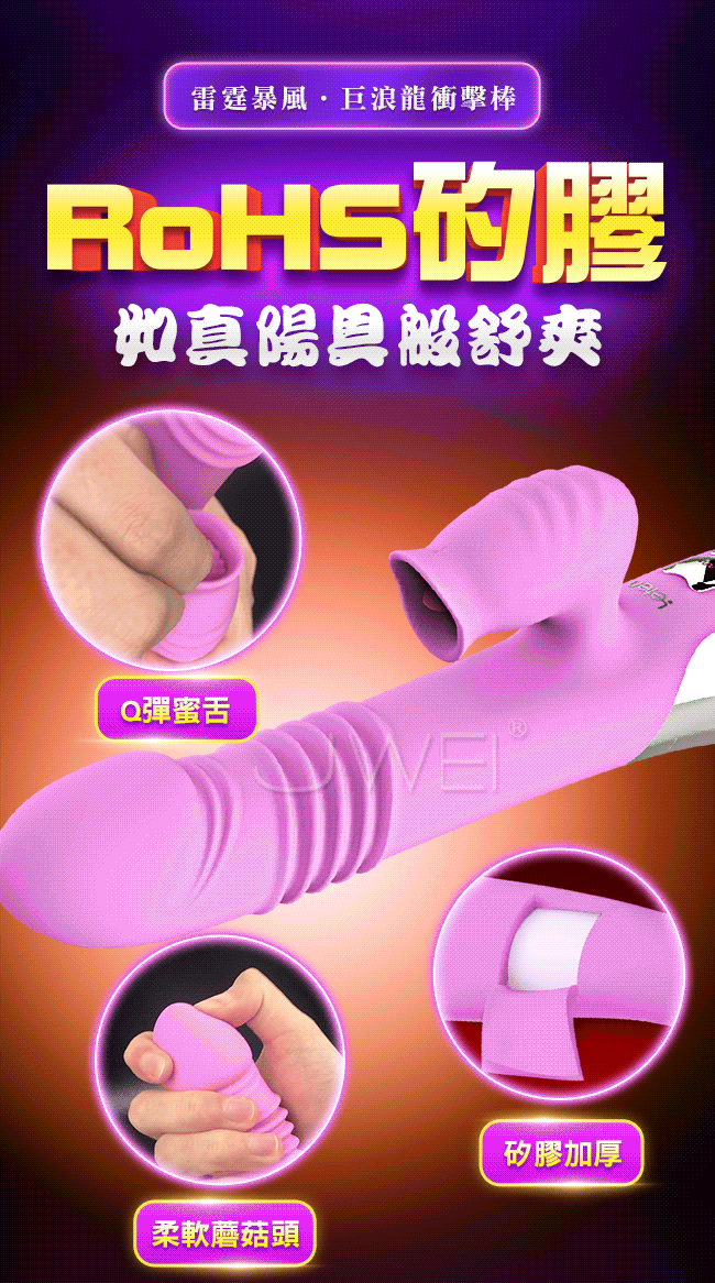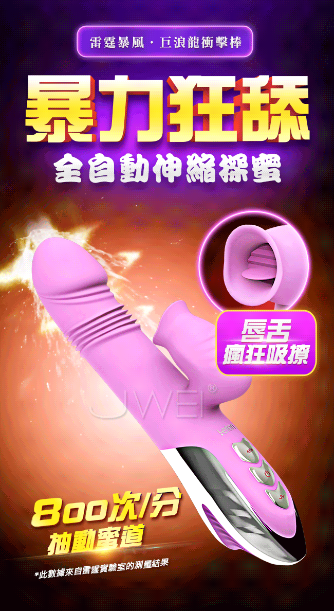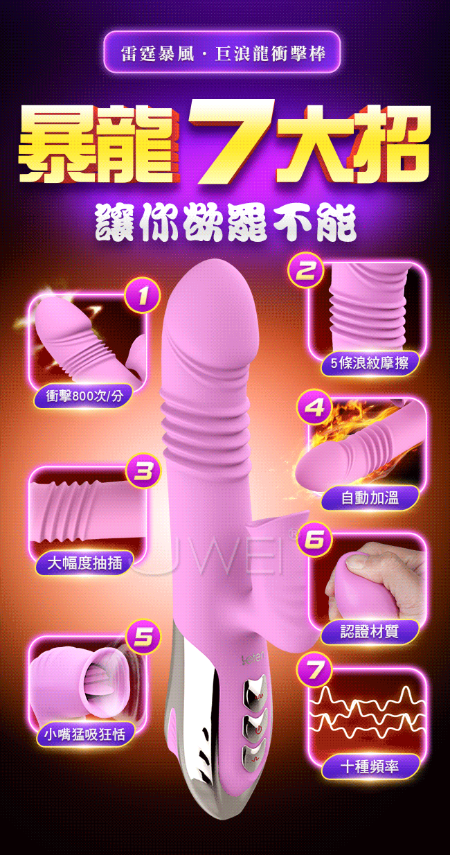 用過N根棒棒,沒有一根真的浪嗎?巨浪龍擁有5層浪紋摩擦及高速全自動伸縮抽插讓您爽到雙腿直顫抖。搭配仿真舌頭,在插入後小嘴含著陰蒂舌頭在裡面狂舔,又吸又舔享受雙重口愛快感。使用彈性親膚矽膠,觸感溫潤如真陽具般舒爽。內置全自動加溫設計,不用開關無需手動控制並在抽插過程中自動加溫,感受到滾滾熱浪的激情。