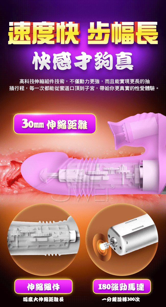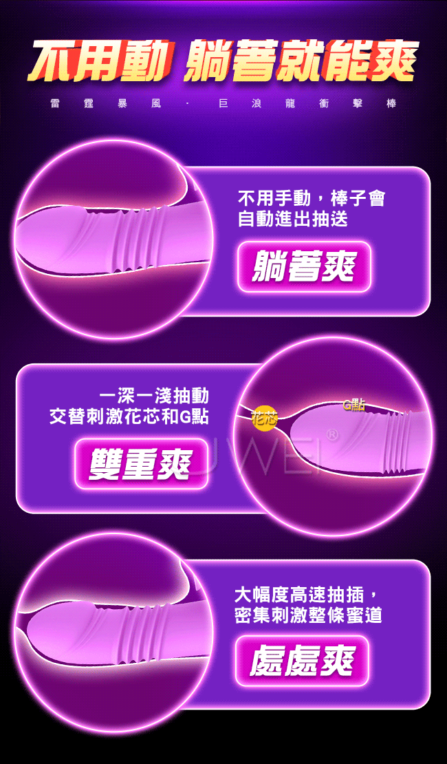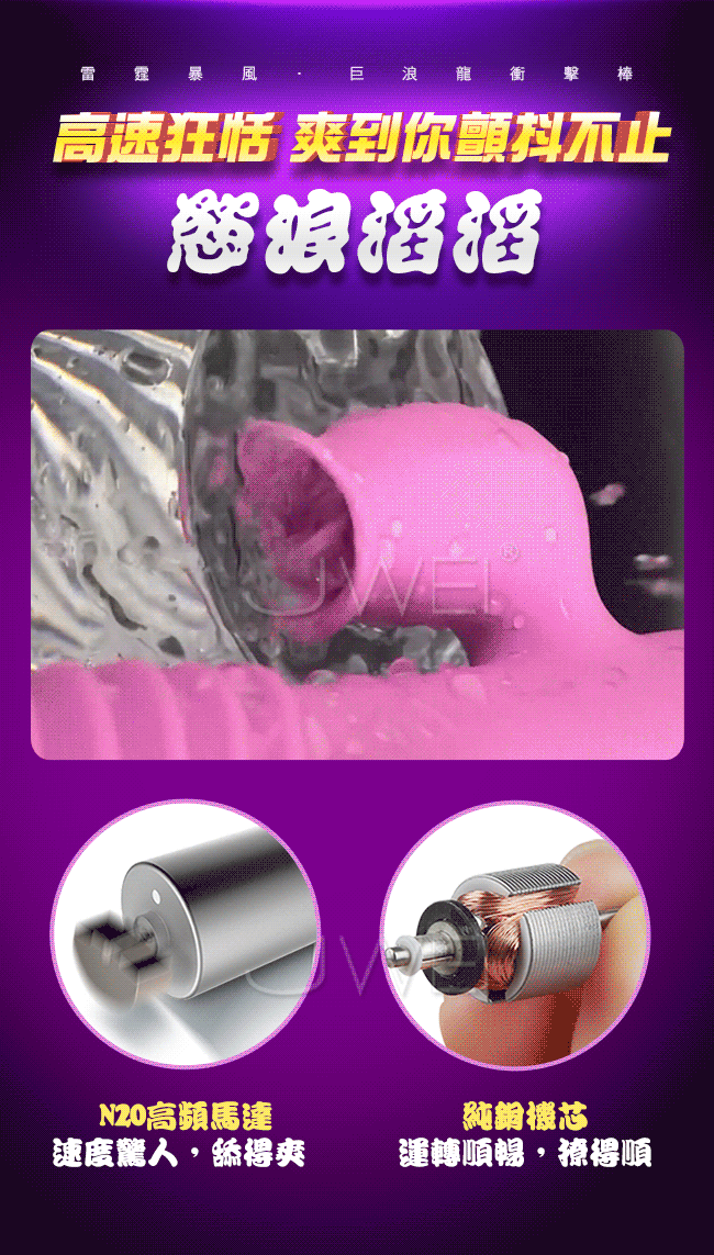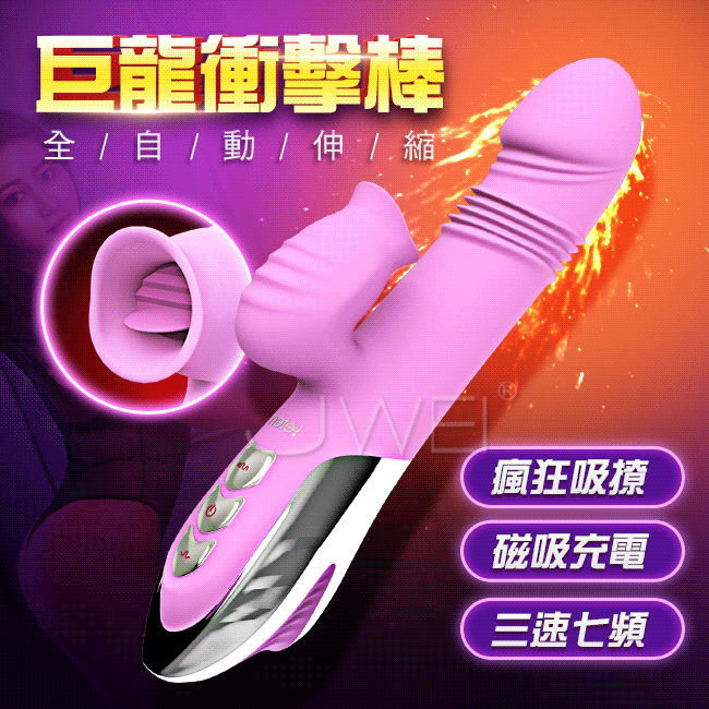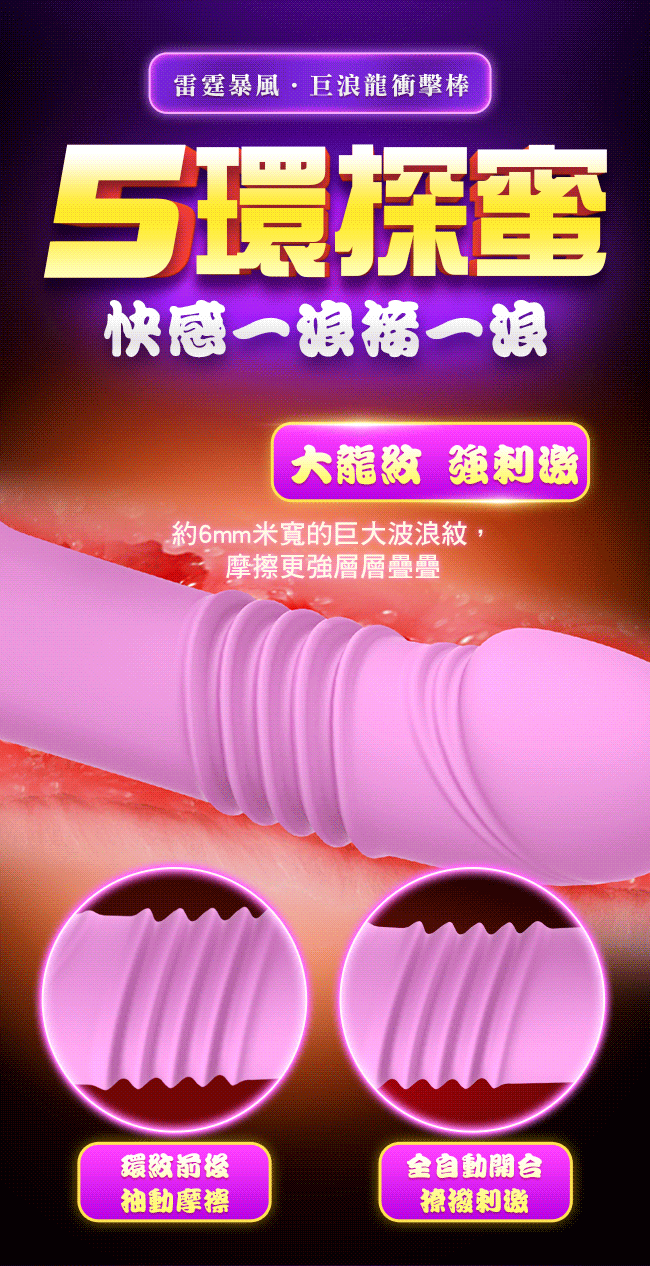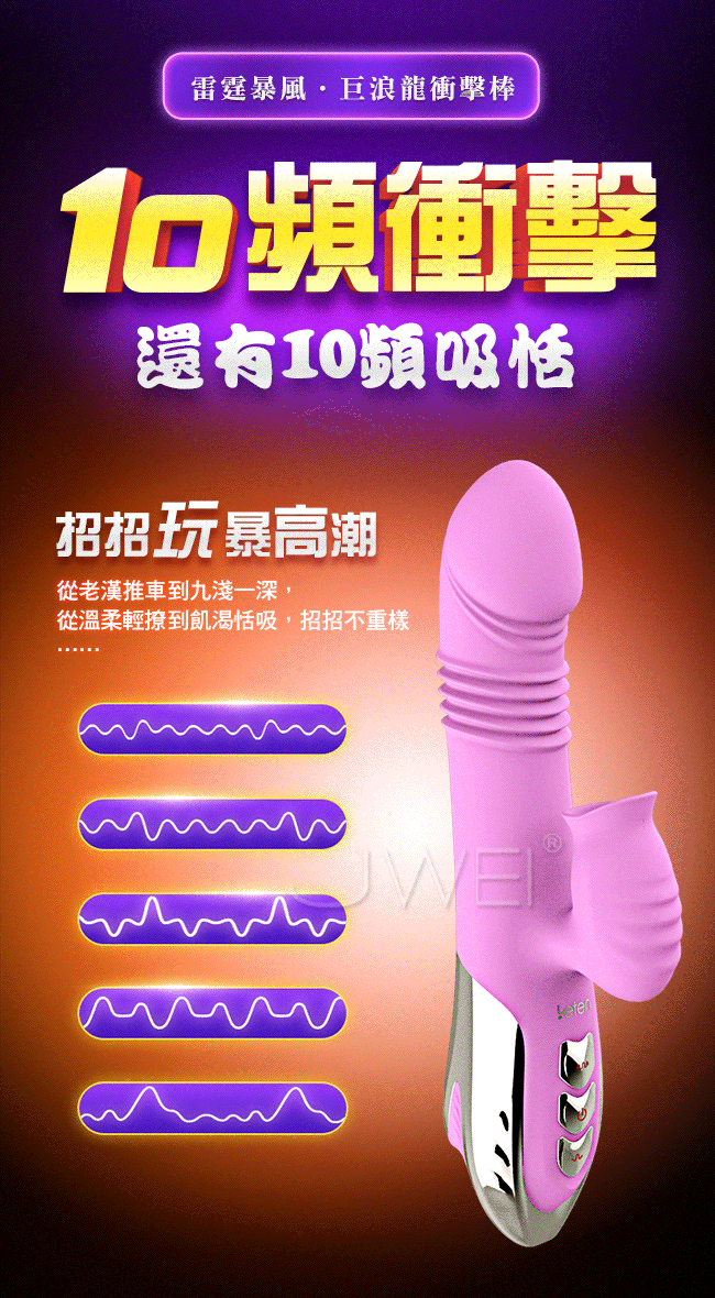 用過N根棒棒,沒有一根真的浪嗎?巨浪龍擁有5層浪紋摩擦及高速全自動伸縮抽插讓您爽到雙腿直顫抖。搭配仿真舌頭,在插入後小嘴含著陰蒂舌頭在裡面狂舔,又吸又舔享受雙重口愛快感。使用彈性親膚矽膠,觸感溫潤如真陽具般舒爽。內置全自動加溫設計,不用開關無需手動控制並在抽插過程中自動加溫,感受到滾滾熱浪的激情。