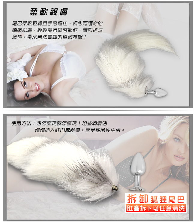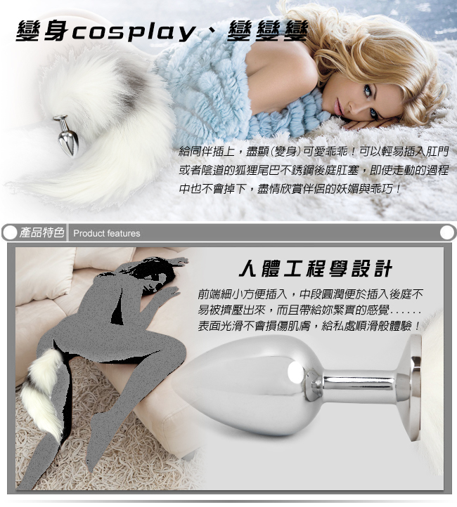 女人狐媚之美,盡在不銹鋼狐尾巴後庭塞! 變身cosplay用具就是這麼神秘,插上肛門塞就變成迷惑狐狸了。 給愛人插上,盡顯狐狸的野性及撫媚!即使走動的過程中也不會掉下,更不用說對此尾巴拉拉扯扯過程中帶來的快感和樂趣...... 快快行動!可以變化的可愛狐狸就是你! 【產品目的】本品是成人遊戲的最佳選擇。體驗另類性愛,增進情趣。 【使用方法】想怎麼玩就怎麼玩!加些潤滑油,慢慢插入肛門或陰道,享受極品性生活。 【產品規格】詳如圖