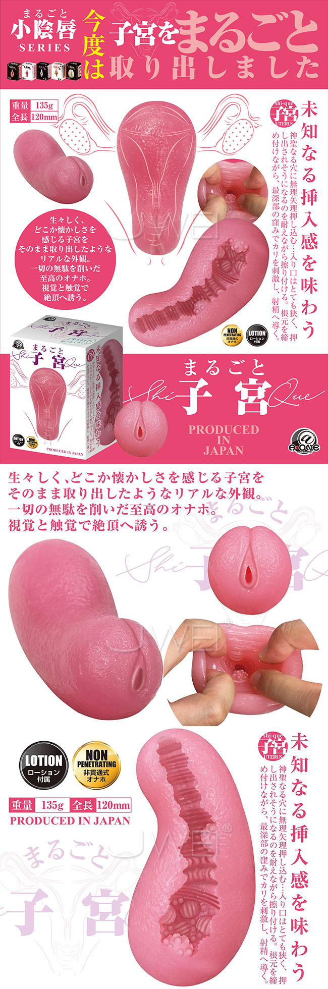 「まるごと」シリーズの新作の登場です。こんどは、子宮をまるごと取り出した生々しい色と形のオナホです。子宮そのままを取り出したようなリアルな外観と、一切の無駄を削いだ至高のオナホール。道の領域、神聖なる子宮を極限まで再現したくなるようなフォルムです。入口はとても狭くて、根元を締め付けながら最深部の窪みがカリをゴリゴリ刺激。胎内回帰、ここに極まる。