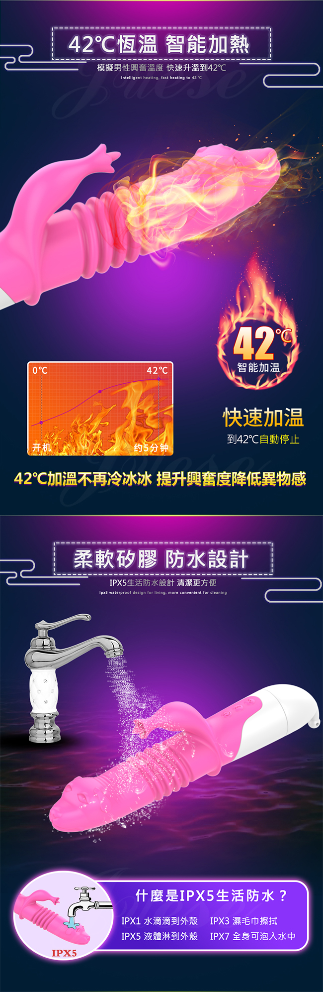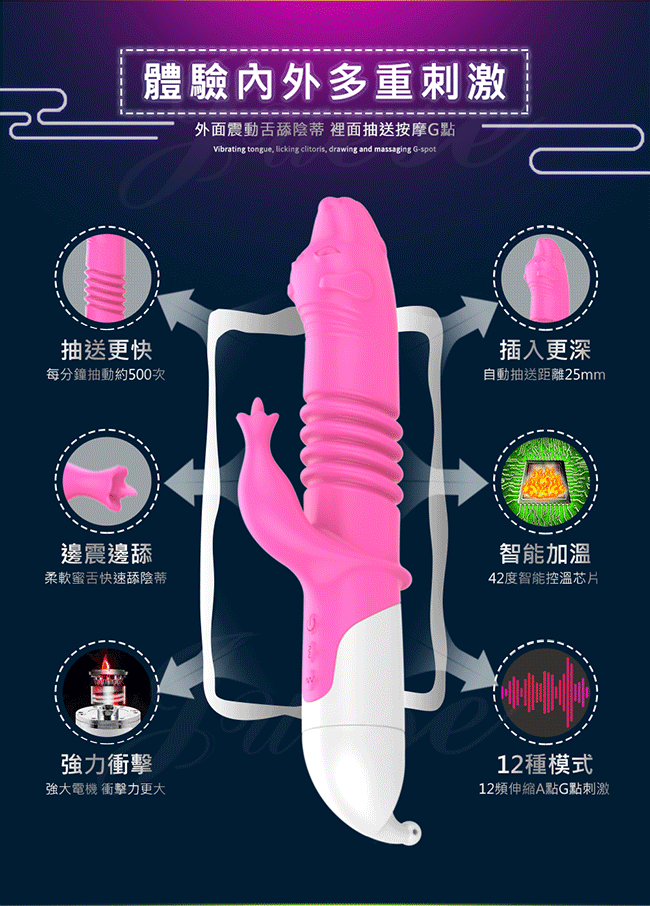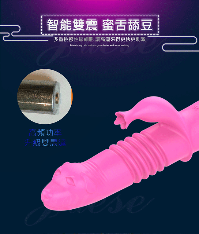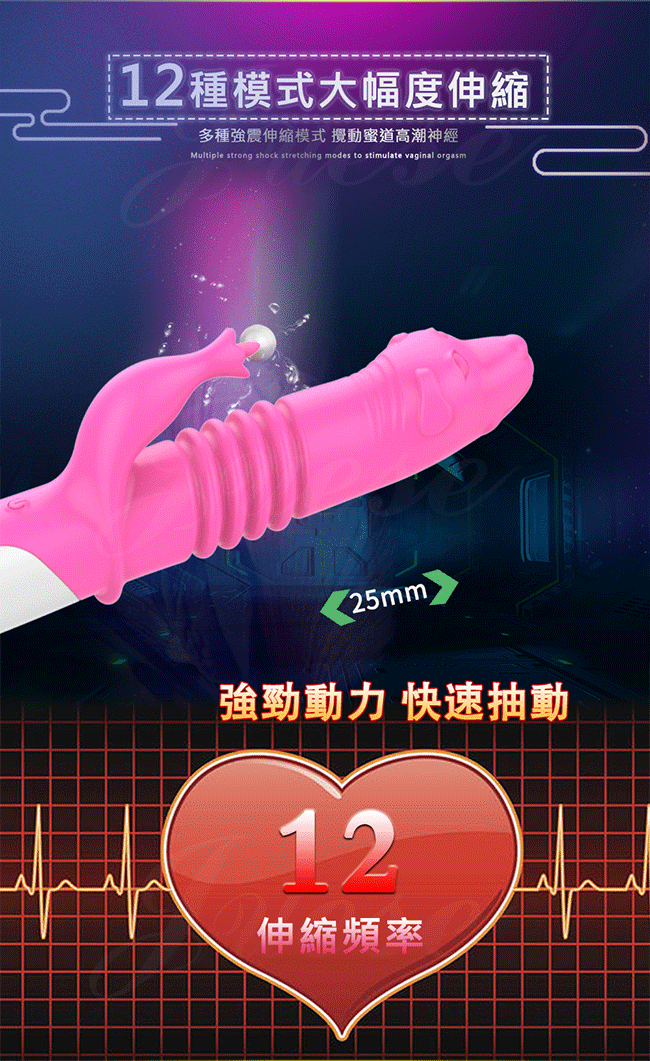 ►您現在的位置:首頁> 狼首伸縮 12段變頻伸縮智能加溫充電震動按摩棒-玫紅