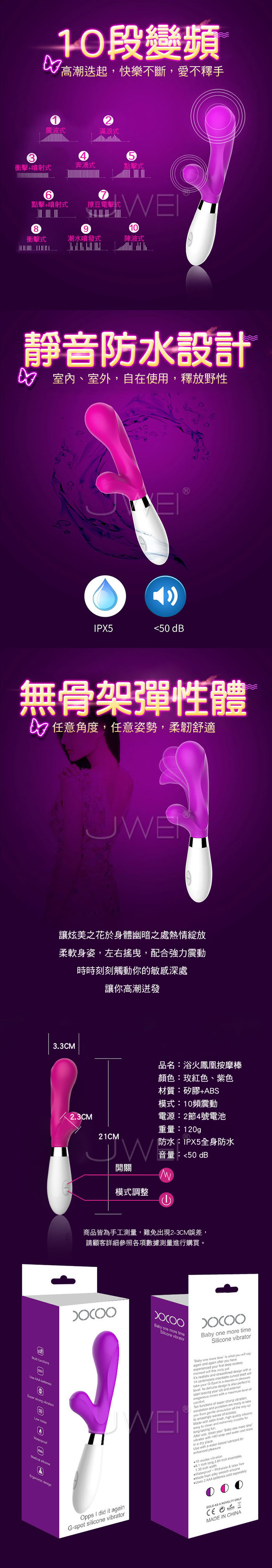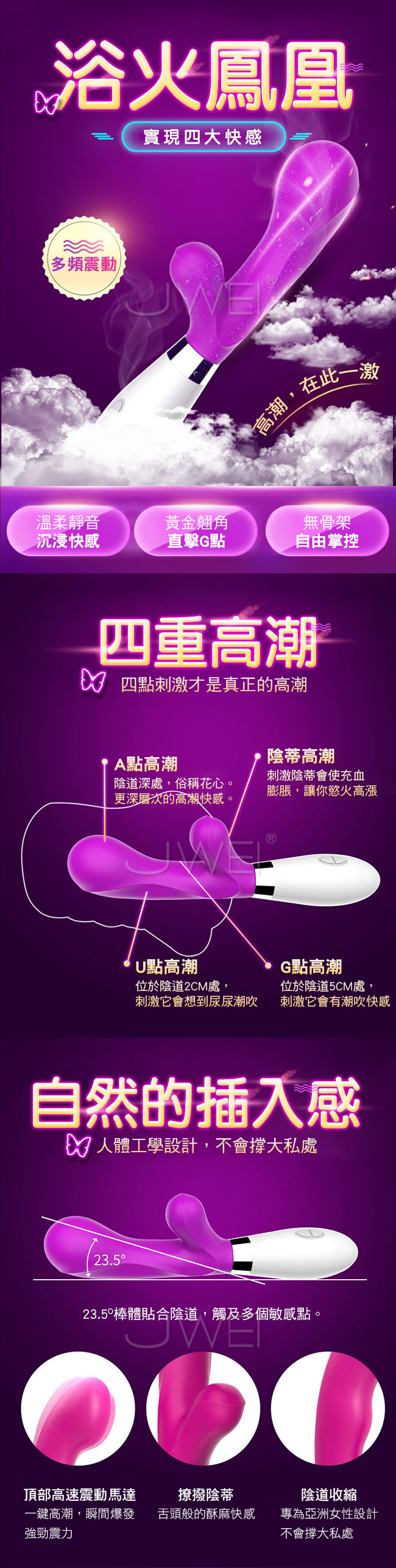 浴火鳳凰女用震動棒讓您享受真正多重高潮,自然的插入感人體工學設計,不會撐大私處23.5度角設計棒體貼合陰道,觸及多個敏感點。擁有10段變頻高潮迭起,快樂不斷,愛不釋手~~採用貼心靜音防水設計讓您不管在室內、室外,自在使用釋放野性。