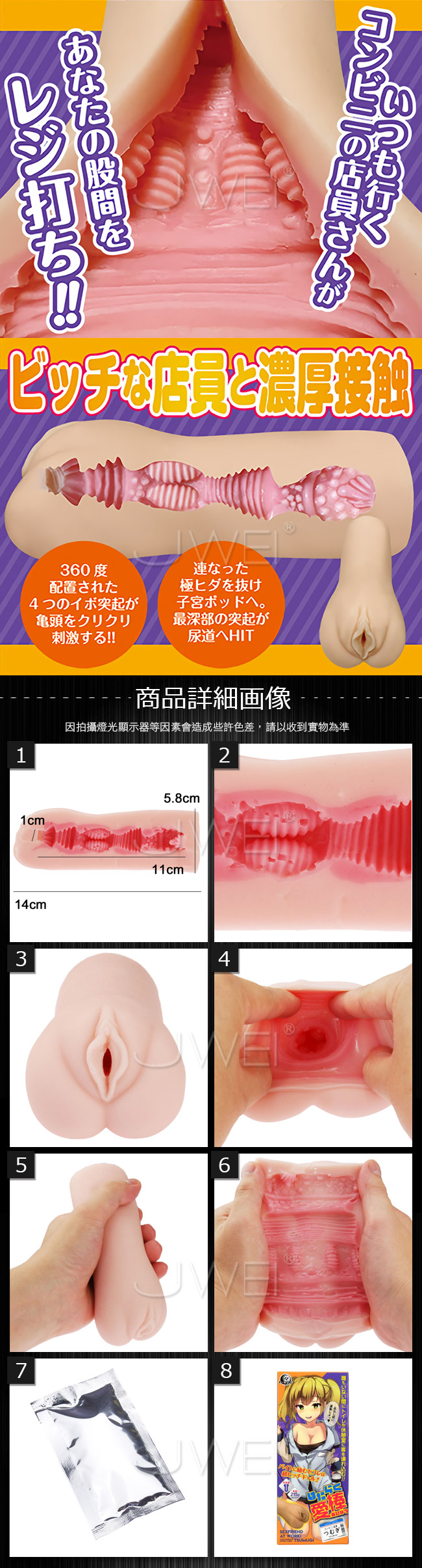 仕事もセックスのいっしょうけんめいな「コンビニ店員・つむぎ」ちゃんのアソコを堪能できちゃうオナホ。 週5でバイトに励むつむぎちゃんは、性に貪欲な超ビッチギャル。360°配置された4つのイボイボ突起が、男性器の先端をぐりぐり刺激します。さらに、連なった極ヒダを抜けると子宮ポケットへ進めば、最深部の突起が尿道へヒット!! 深夜のコンビニへ客を連れ込み、朝の5時までヤリまくる、ビッチな店員と濃厚接触しちゃってください。