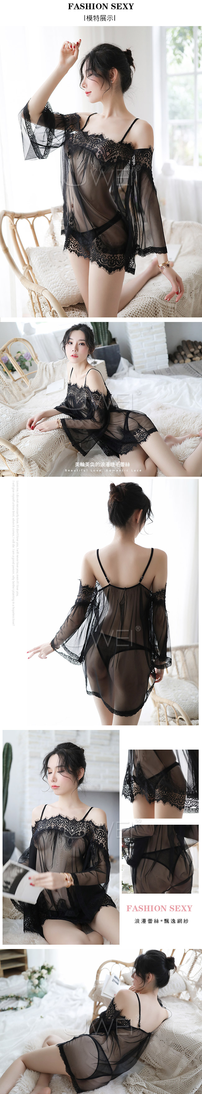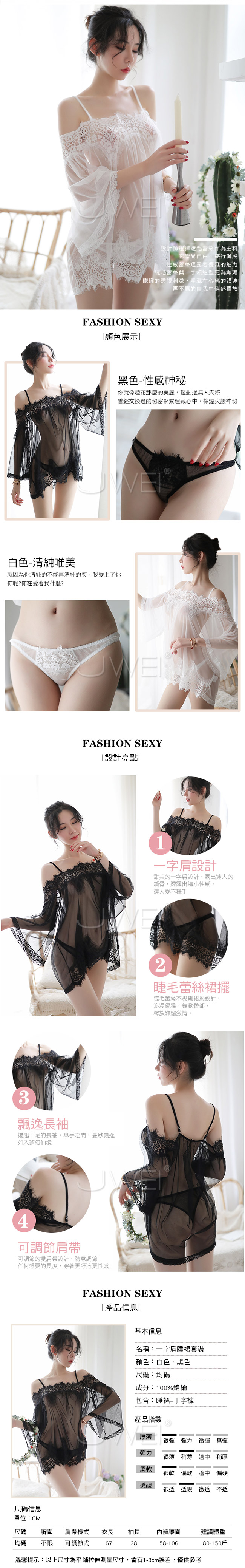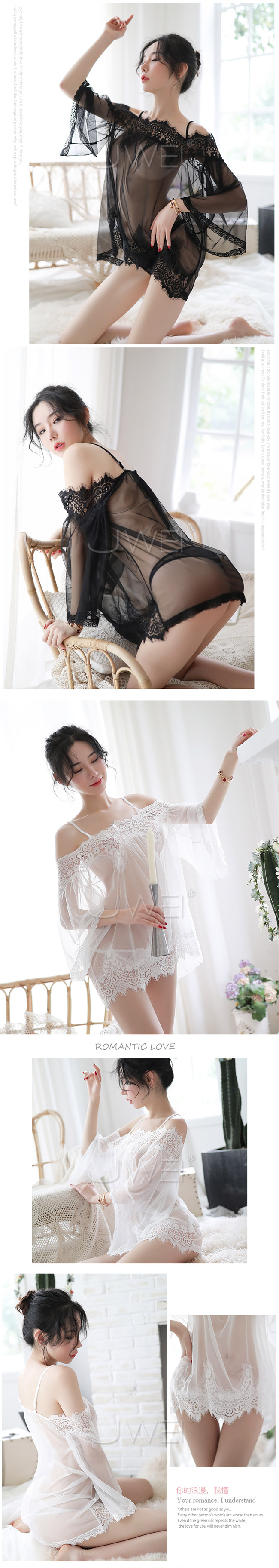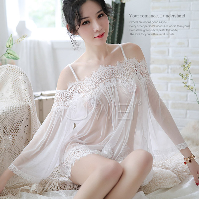 ◇◆豢養浪漫.性感一字肩睫毛蕾絲透視吊帶睡裙(白色)◆◇
