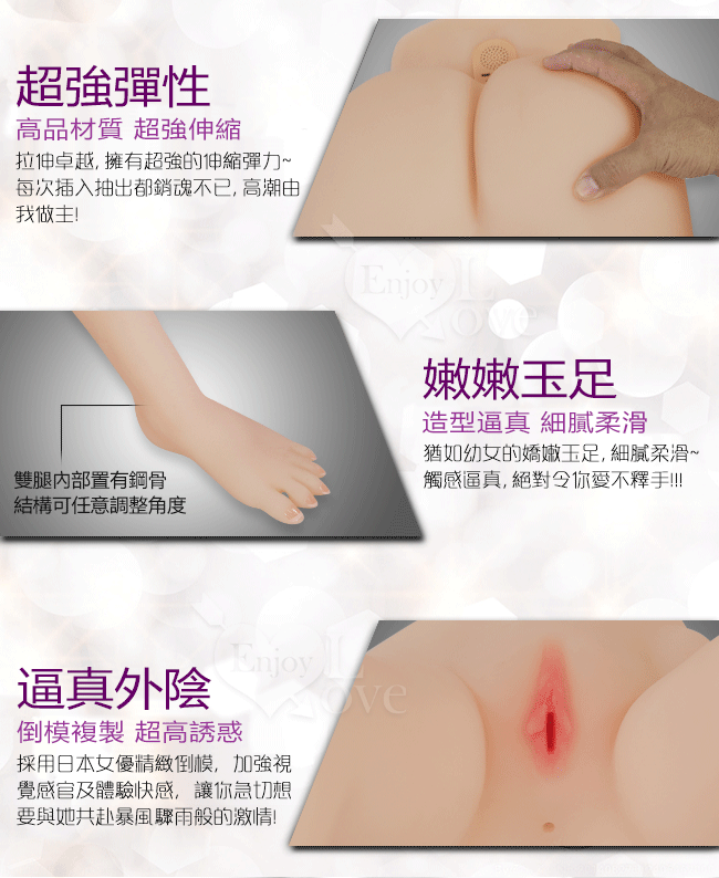 ※ 本品為雙交功能(陰交,肛交功能),實品為帶不銹鋼骨骼的矽膠體,膝蓋關節,腳踝都可任意折疊轉換大腿姿勢。 ※ 此產品詳細說明及樣式如圖所拍攝,敬請參閱選購。 ※ 隨貨贈送潤滑油200cc、情趣內褲、清洗器、保險套、加溫棒、保養粉及收藏袋(恕隨機)等... ※ 本產品因體積過大,超過便利店規定,所以恕不能使用超商取貨方式。