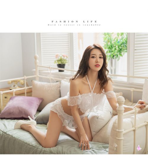 首頁>情趣睡衣 純白挑逗蕾絲雪紡二件式繞頸短版套裝睡衣