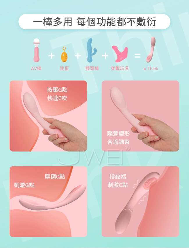 e-ThinkU型按摩棒懂你想要的,採用U型結構設計可隨意掰灣,讓您一棒多變根據使用需求輕輕一掰,即可讓G點震動棒變成雙刺激跳蛋。內置前後雙馬達固定型態多種震動模式玩法多樣~也可當穿戴器使用任意固定彎度,不擔心撐大私處。