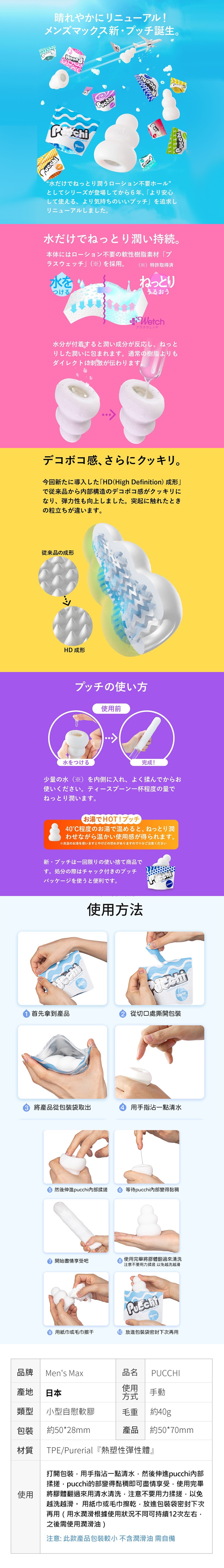Pucchi是由只需要加入些許水分就能夠產生濕潤物質的材質【+Wetch】製成的,使用時不需要再加入潤滑劑。