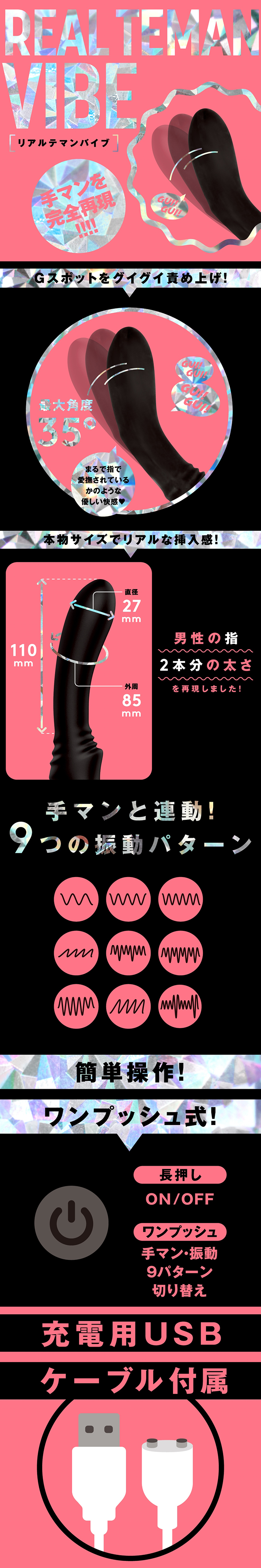 神指技術!完全再現指交!大大針對G點,最大角度35度!讓您體驗逼真插入感覺的按摩棒,再現了男性兩根手指的粗細。直徑為27毫米的細長設計,初學者也推薦使用。觸感光滑柔軟的矽膠,可以順利插入。最強的指法,最好的指交體驗與也推薦用於開發陰道高潮_9種指交&振動模式&完全防水IPX7等級&靜音設計&附屬充電的USB線。審查編號:2104943