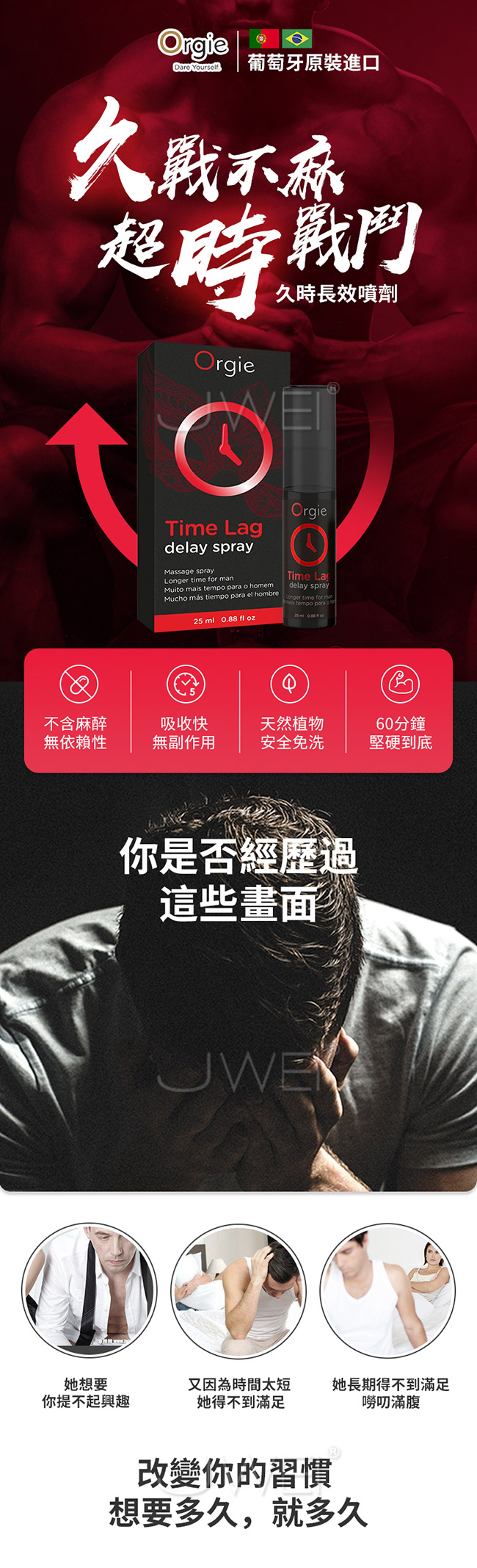 TIME LAG久時長效噴霧劑讓您重新體驗久戰不麻,超時戰鬥的快感。此款採用有饑性因子從皮膚層快速滲進海綿體,讓您有效延長時間達60分鐘,提升戰鬥力的同時也不影響自身敏感度,適合長期使用不殘留、不依賴、無副作用,讓您可安心使用從新做個真正大男人哦~