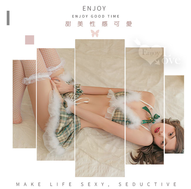 | 魅力聖誕派對!毛茸邊綠格紋比基尼後綁帶百褶短裙六件式套裝