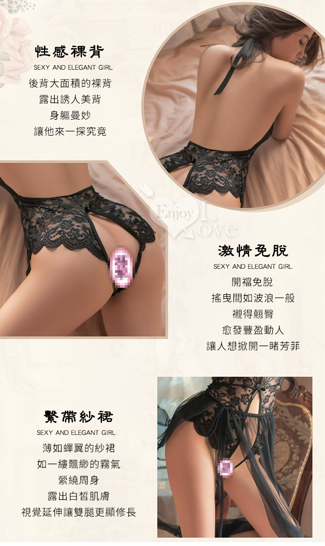 狂野連身衣!V領清透花卉裸背開襠連身衣含紗裙兩件組﹝黑﹞