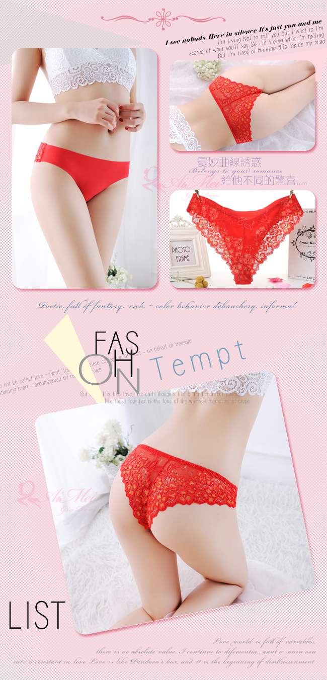誘惑著那極欲探索的深情之處, 美好的事物總是讓人想一探究竟! ※ 內褲款式:三角褲。 ※ 設計特色:蕾絲拼接冰絲。 ※ 商品材質:100%POLYESTER。 ※ 功 能:性感、美體。 ※ 腰 型:低腰。 ※ 顏 色:紅色。 ※ 商品尺碼:FREE SIZE (適合腰圍23~29吋)。 ※ 長度單位換算 : 1吋=2.54cm。 ※ 注意事項:基於保障消費者個人衛生,此貼身衣物恕不接受退換貨,謝謝您! (如為商品本身暇疵,接受七日內換貨,請勿試穿,謝謝您)