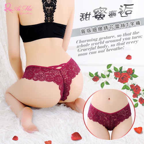 | 甜蜜邂逅!寬版細緻綉花蕾絲T字褲﹝酒紅﹞