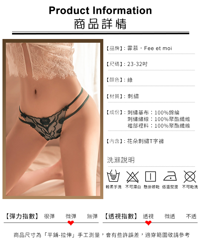 神秘地帶花朵刺繡雙彈力細帶T字褲﹝綠﹞