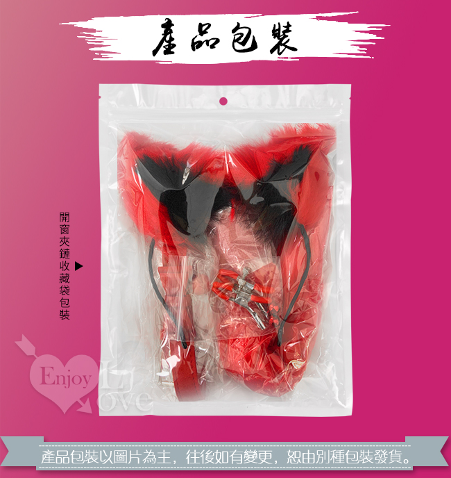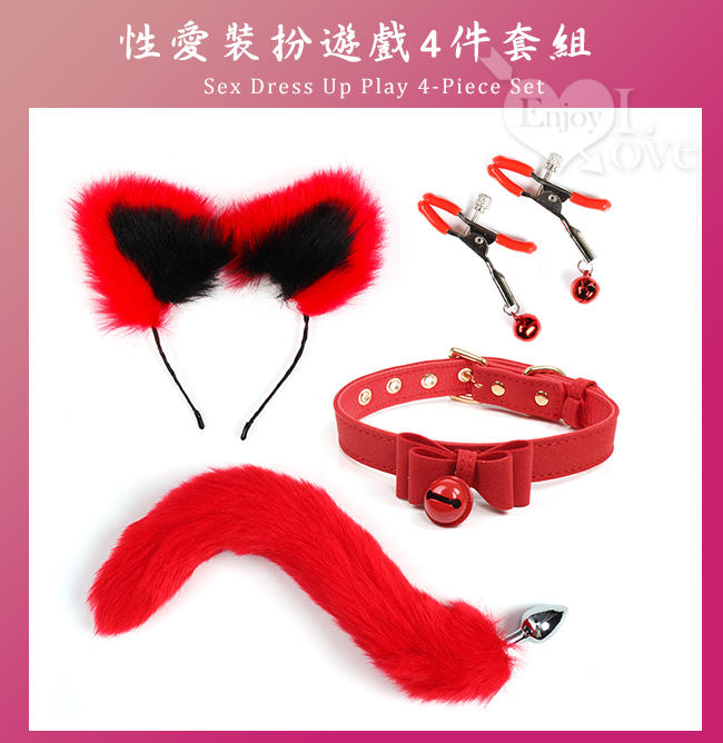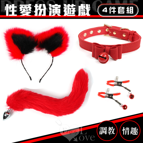 性愛裝扮遊戲4件套組﹝鈴鐺乳夾+狐狸尾巴+毛絨髮箍+皮革鈴鐺頸圈﹞紅