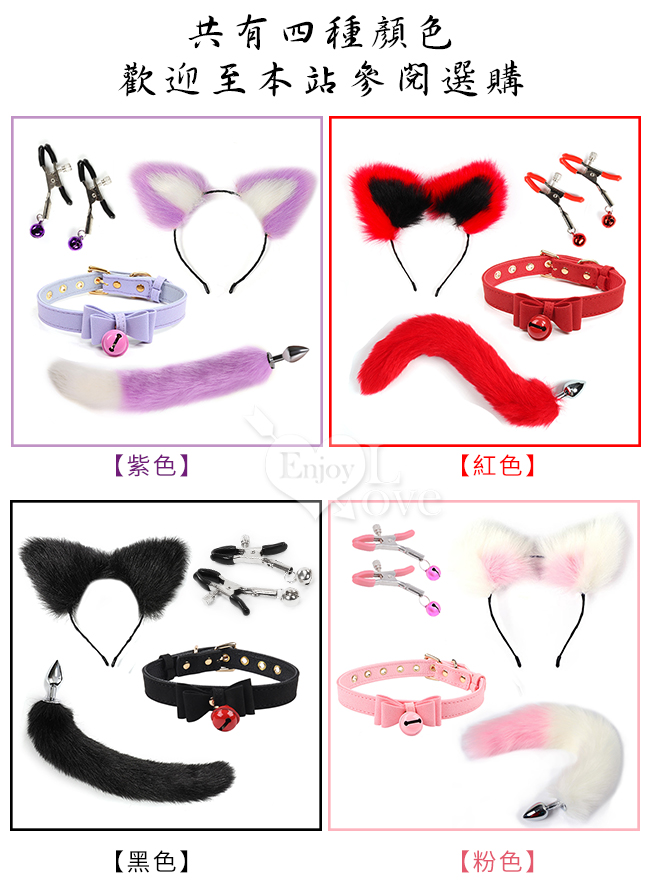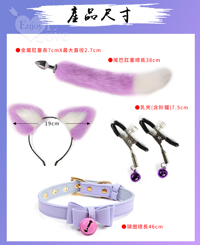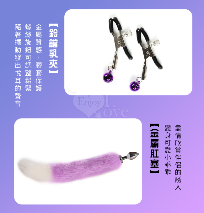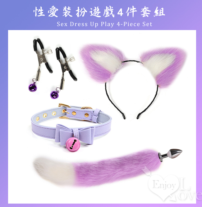 性愛裝扮遊戲4件套組﹝鈴鐺乳夾+狐狸尾巴+毛絨髮箍+皮革鈴鐺頸圈﹞紫