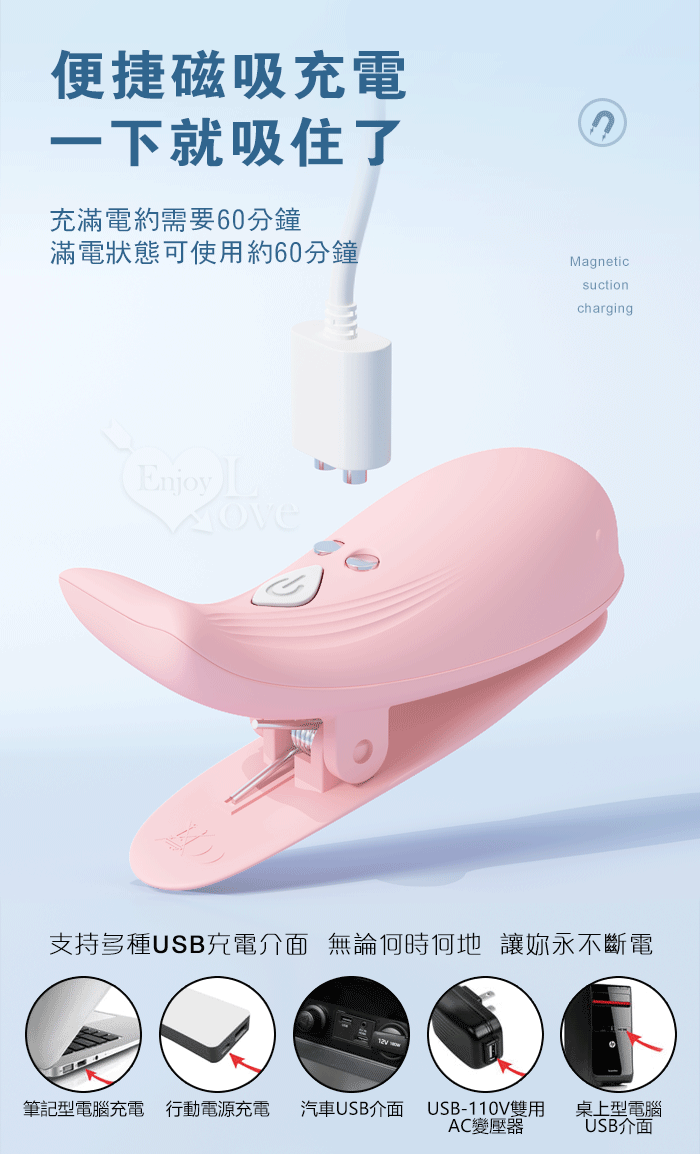 ►您現在的位置:首頁>Dolphin 小海豚 ‧ 無線遙控10頻強勁震動磁吸充電乳夾 - 自由掌控/前戲挑逗﹝藍﹞