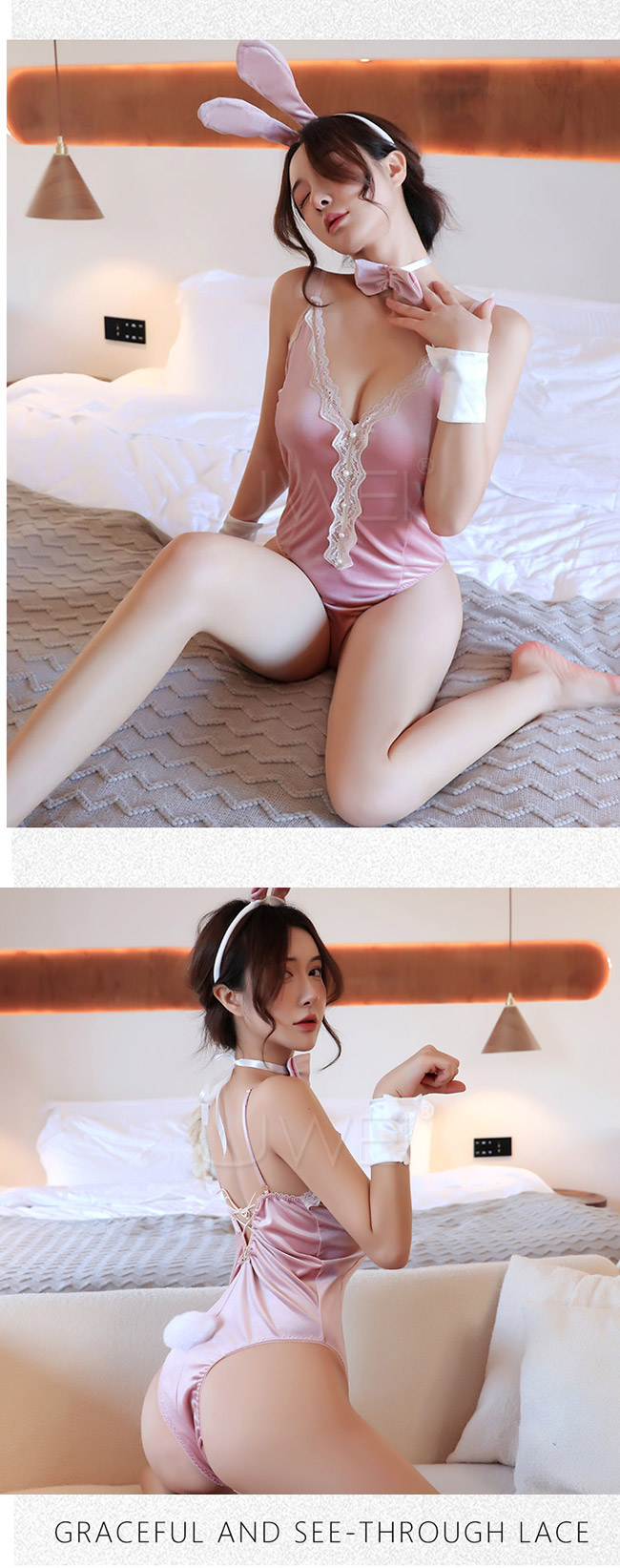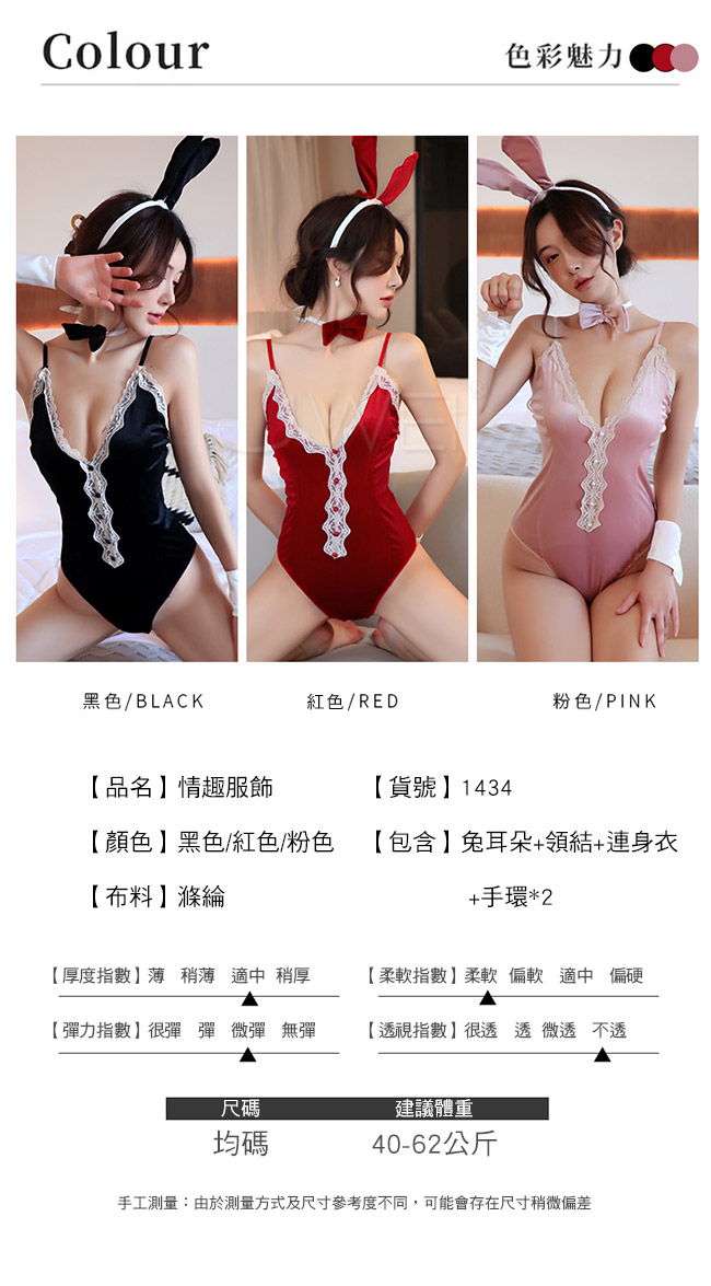 | 蜜桃魅影.性感蕾絲深V露背側高叉兔女郎連身衣4件組(黑色)