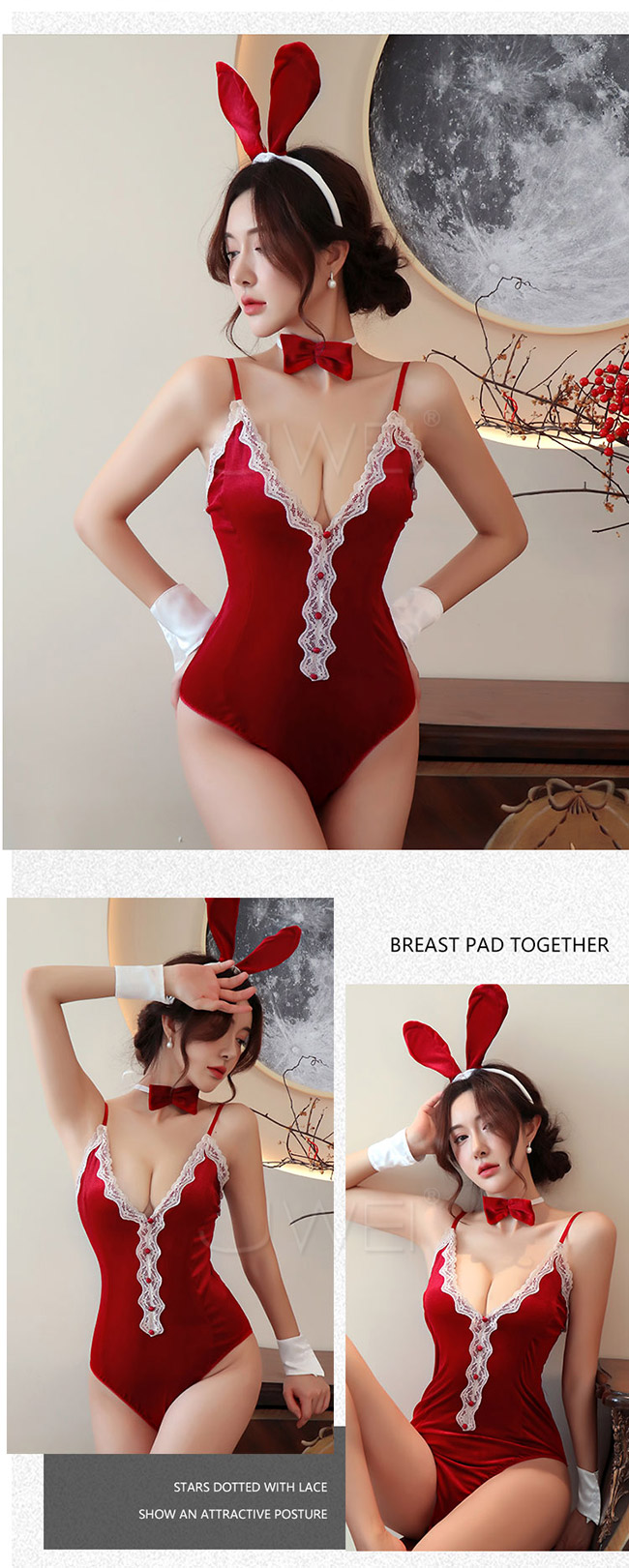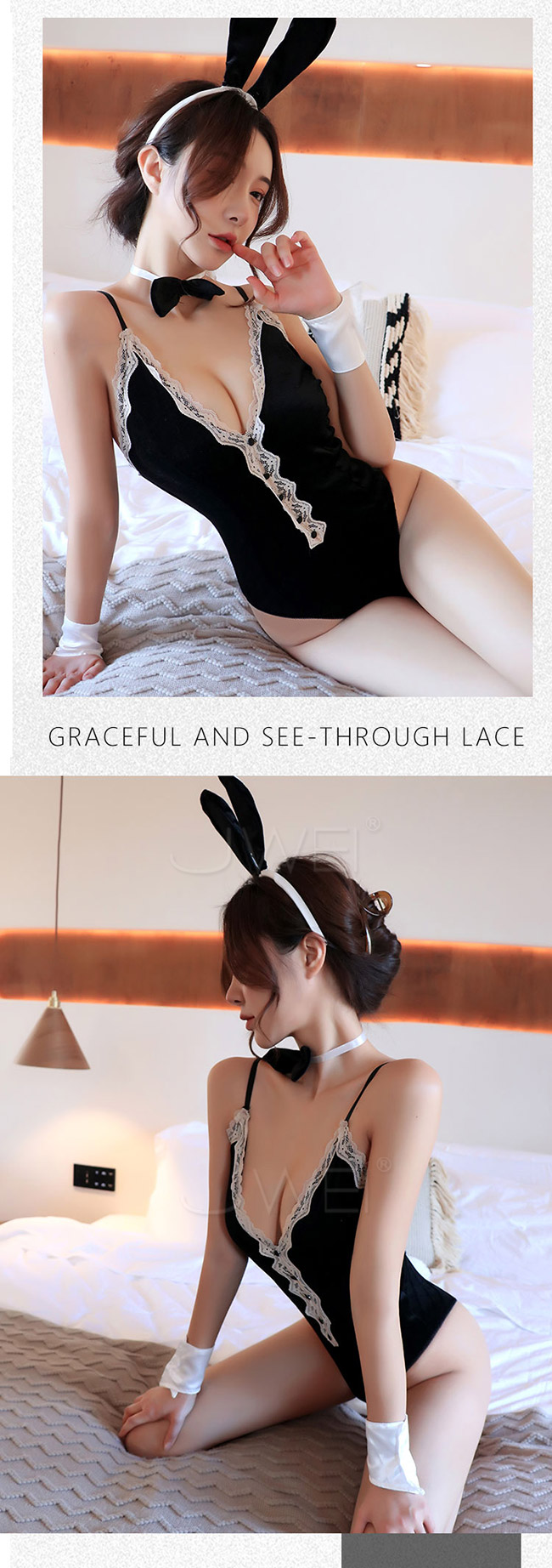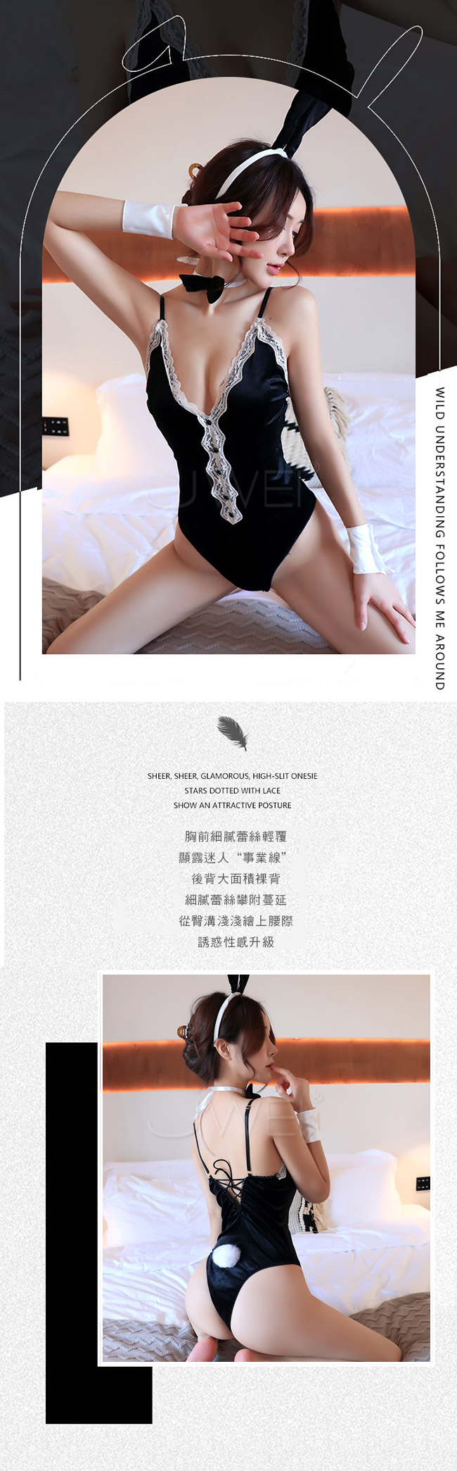 ◇◆蜜桃魅影.性感蕾絲深V露背側高叉兔女郎連身衣4件組(黑色)◆◇