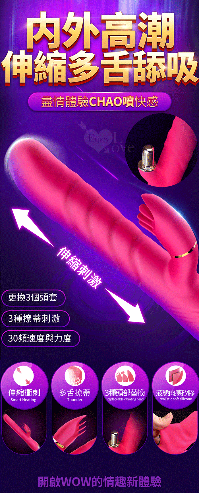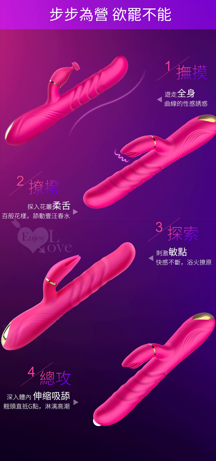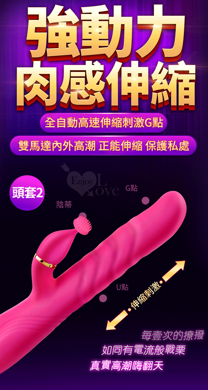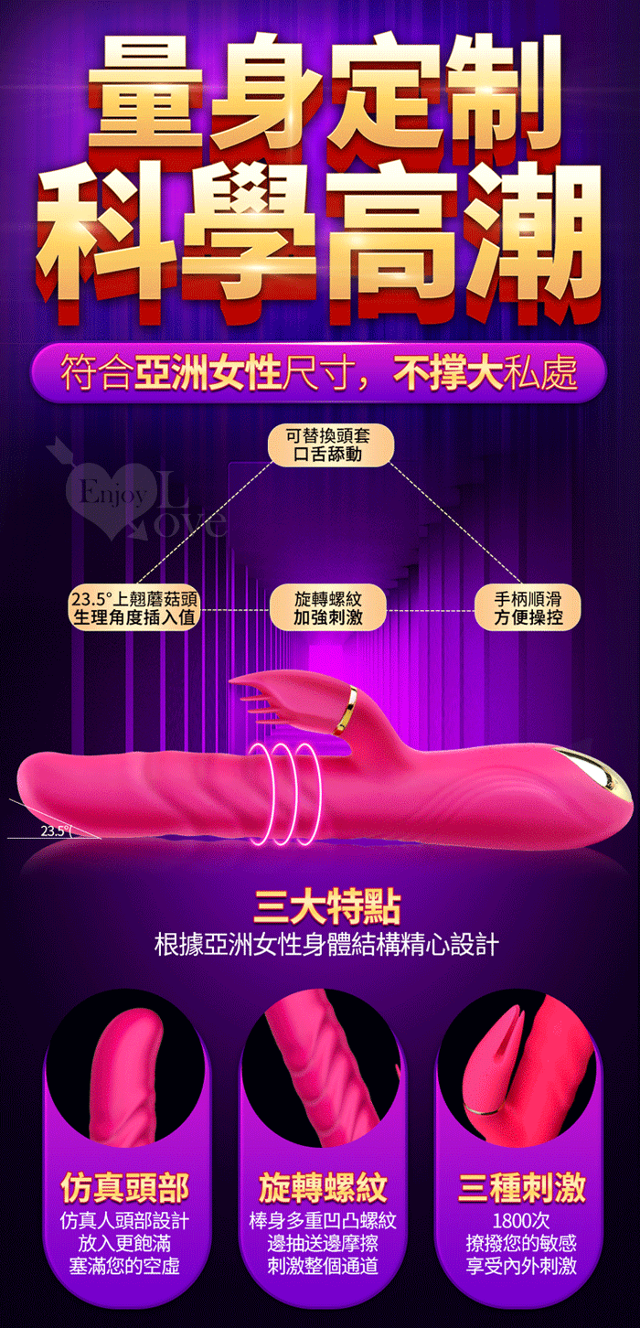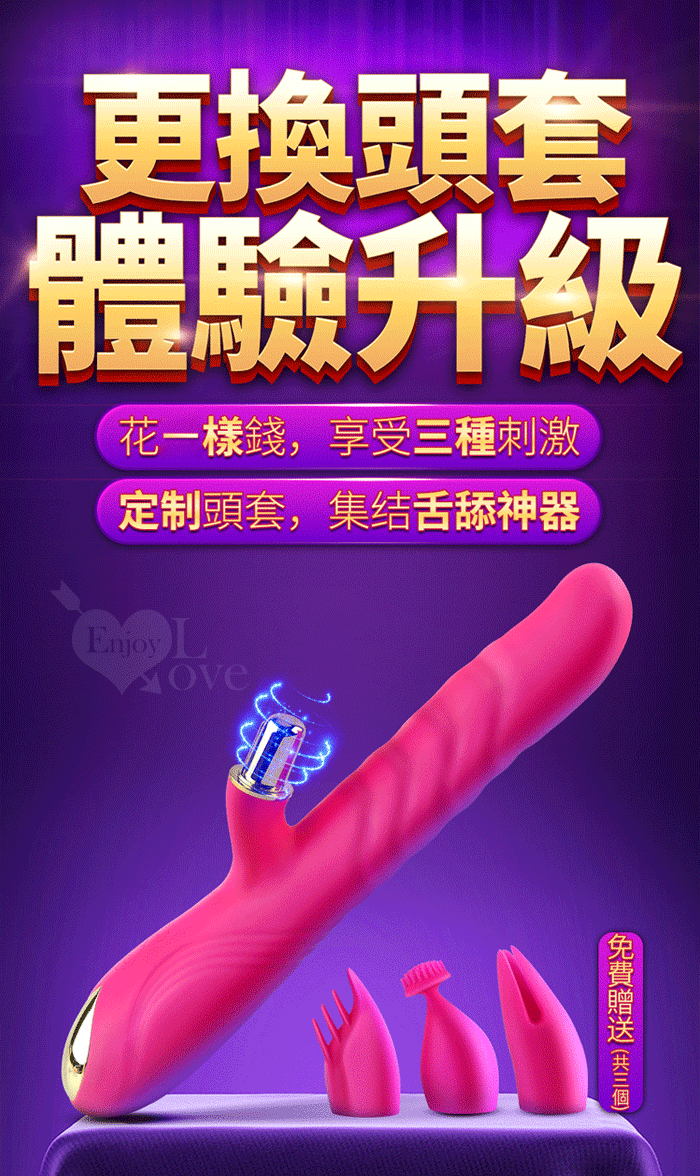 1、全自動高速伸縮刺激G點 2、3種小頭軟舌組合舔動撩撥刺激蜜豆 3、伸縮,舔動,撩撥一棒多用 4、雙馬達內外高潮 5、小頭不同造型,多重撩撥刺激敏感 6、全身防水靜音 7、液態矽膠 柔軟舒適 ■充電方式:直插充電 ■充電時長:2小時 ■使用時長:1小時 ■產品尺寸:詳如圖 ■出貨顏色:玫紅色