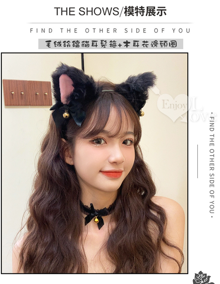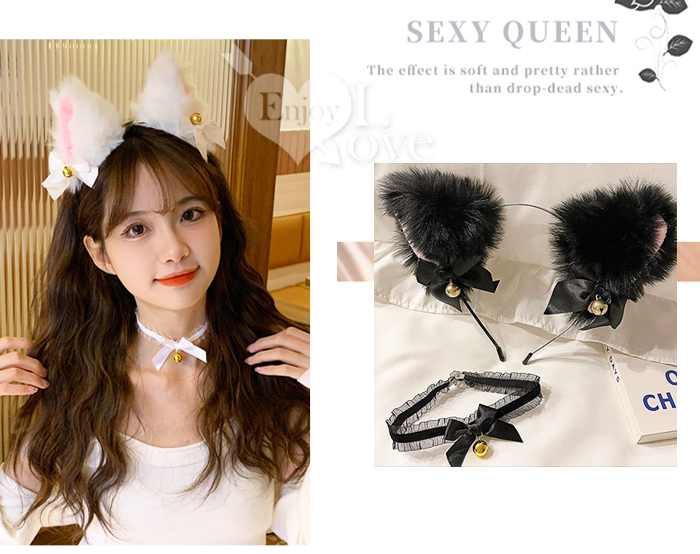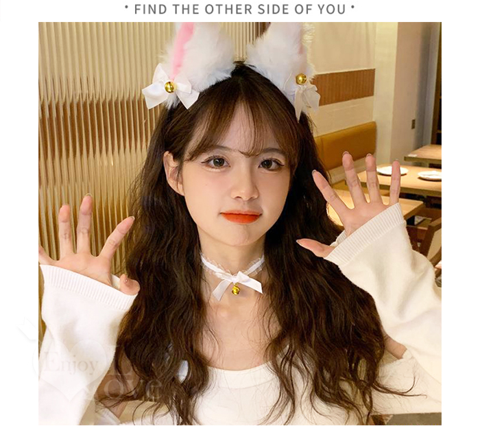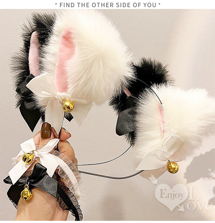 做你的寵物-毛絨鈴鐺貓耳髮箍+木耳花邊頸圈兩件組﹝黑﹞