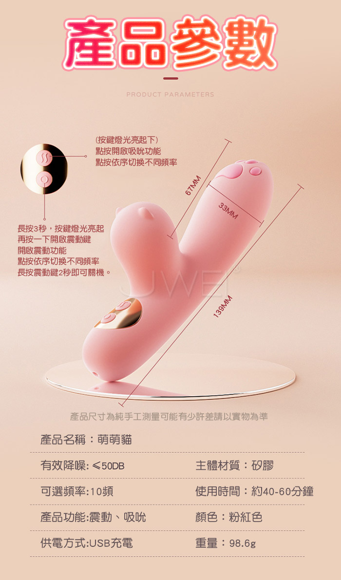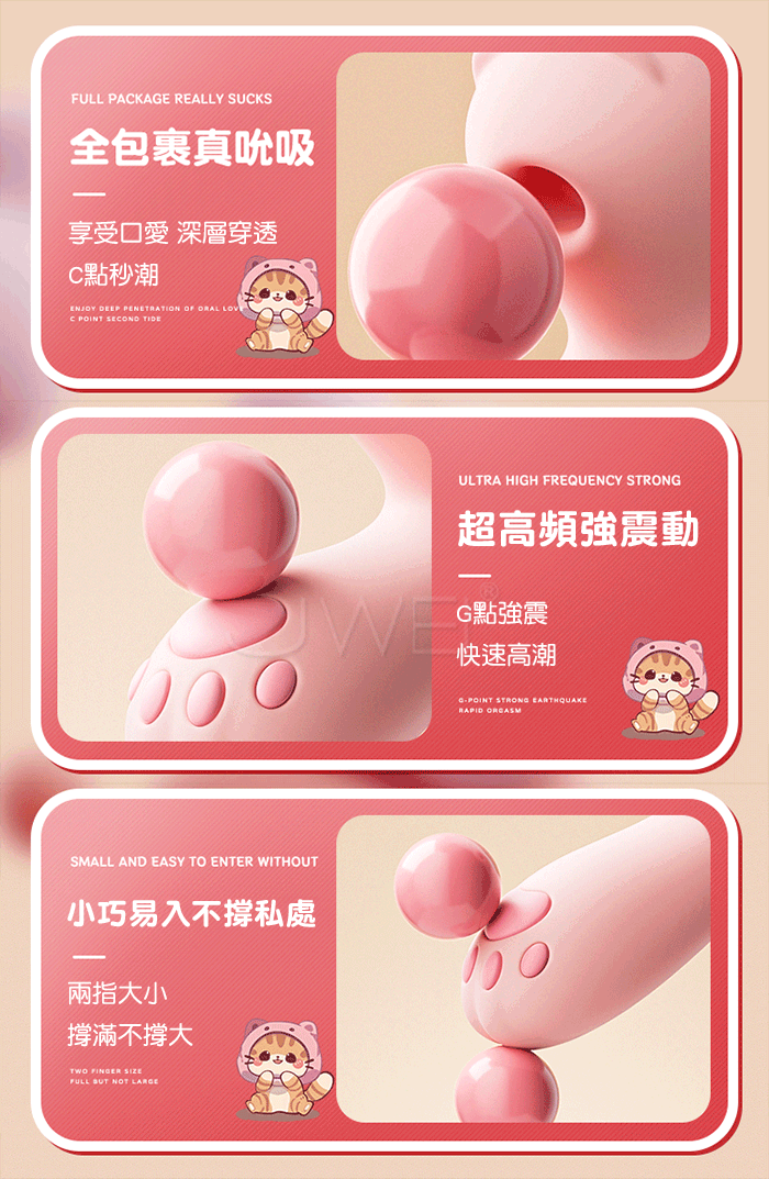 萌萌猫迷你震動棒,吸吮+震動=萌新也能輕鬆GET高潮, 全包裹真吮吸,享受口愛深層穿透,C點秒潮超高頻強震動,G點強震快速高潮。 小小身材大大能量,10頻強震,每一頻震動,都是春風撩撥少女心,如含似舔動感裹吸活引。 全身防水,享受不挑地點,愛的開始沒有結界。