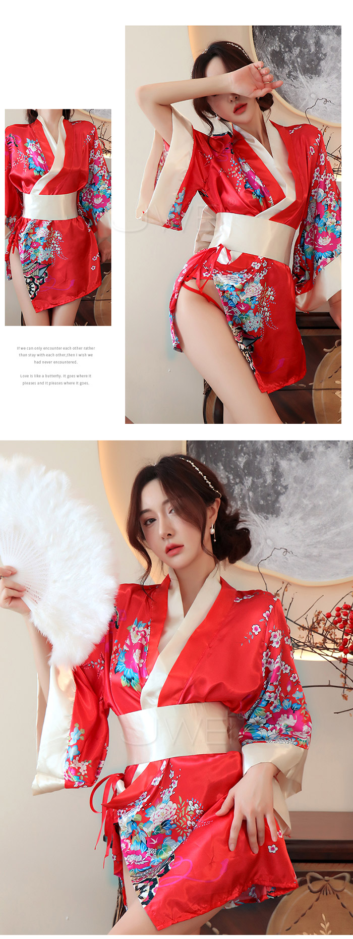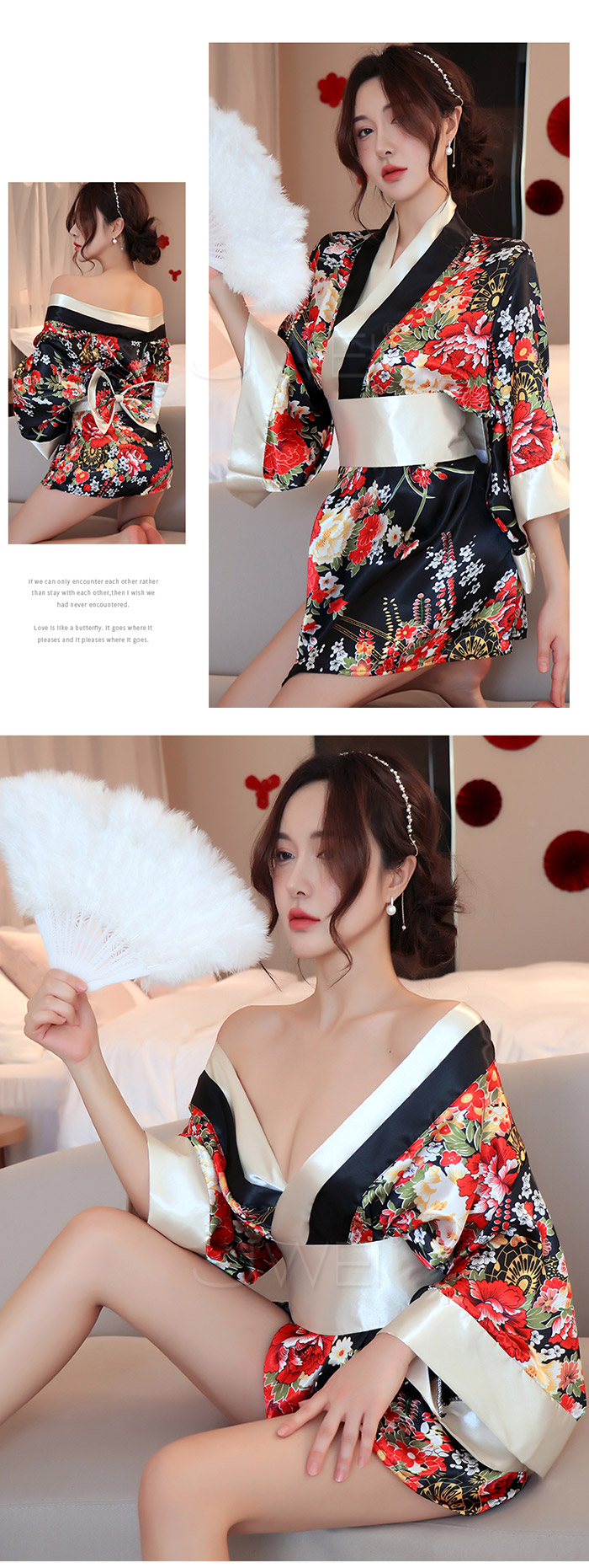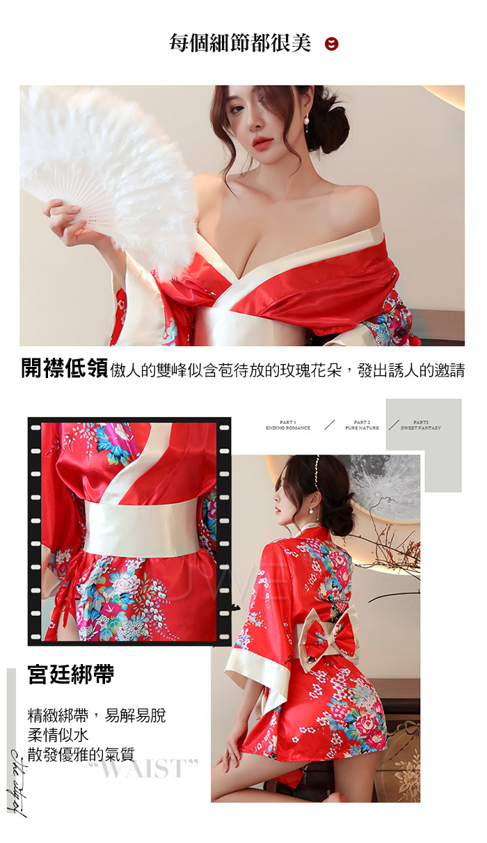 ►您現在的位置:首頁>花莎情露.性感誘惑開襟V領印花日式和服套裝3件組(黑)
