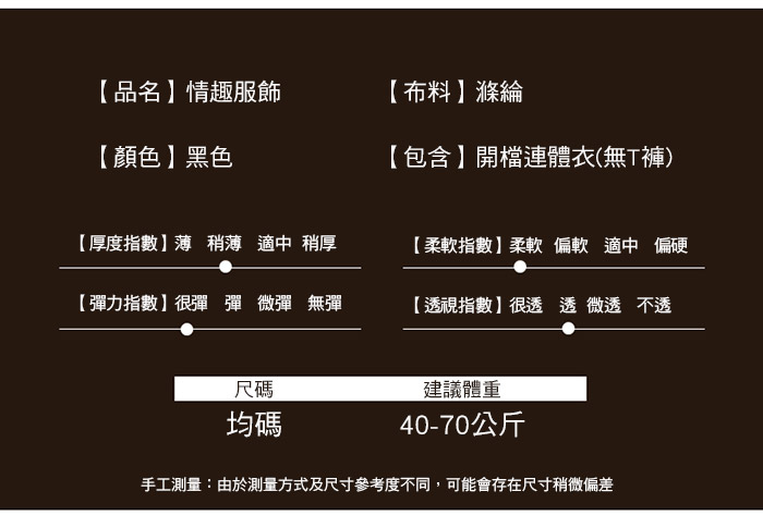 ■內容物:連身吊襪x1(無T褲) ■適穿尺寸:FREESIZE ■彈性:些許 ■未撐開平量尺寸正負誤差1~2cm,1吋=2.54cm ■注意事項:基於保障消費者個人衛生,此貼身衣物恕不接受退換貨。 (如為商品本身暇疵,接受七日內換貨,請勿試穿,謝謝您)