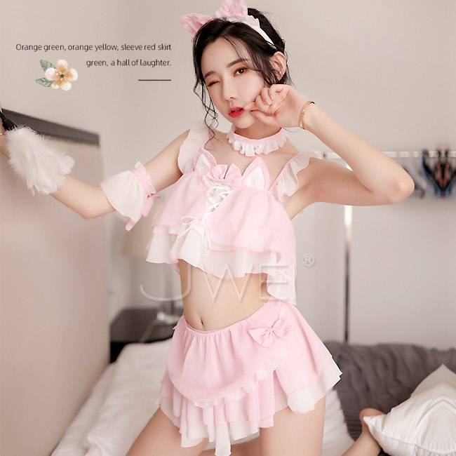 | 女僕角色扮演服!俏萌兔耳愛心波點透視開襠連身衣四件式套裝