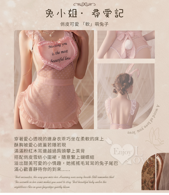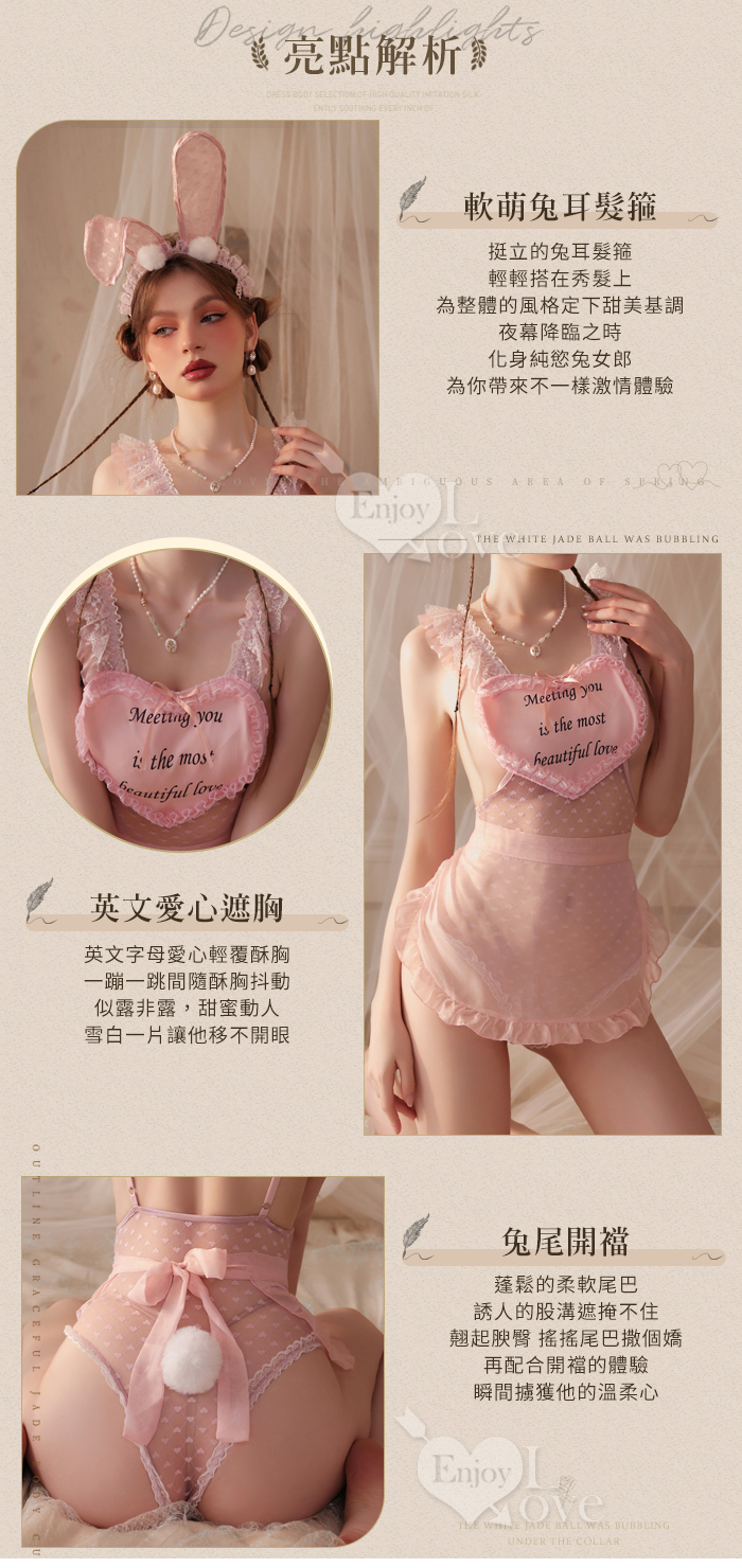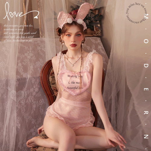 ►您現在的位置:首頁>女僕角色扮演服!俏萌兔耳愛心波點透視開襠連身衣四件式套裝