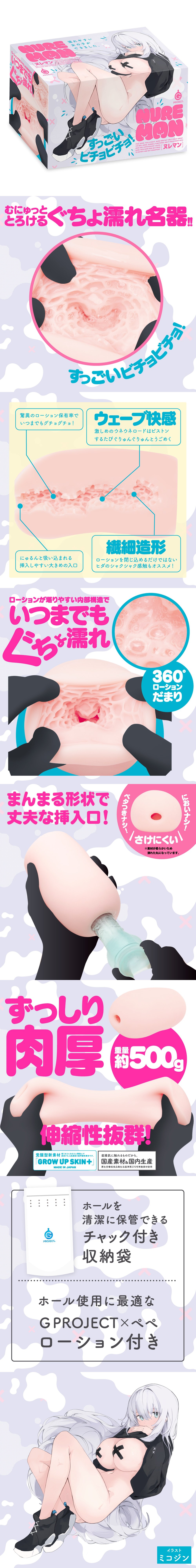 むにゅっととろけるぐちょ濡れ名器!すっごいビチョビチョの濡れやすい女の子ができました!360°ローションだまり!驚異のローション保有率でいつまでもグチョグチョ!激しめのウネウネロードはピストンするたびにぐりゅんぐりゅんとうごめくウェーブ快感!ヒダのシャクシャク感触もオススメでローションを閉じ込めるだけではない繊細な造形です!ずっしり肉厚な重量約500gの中型ホールです。覚醒型素材【GROW UP SKIN+】は使うほどにあなたに馴染んで成長する人肌感覚の超やわらかい伸縮性の素材です。直接肌に触れるものだから安心の国産素材&国内生産 MADE IN JAPAN。パッケージイラスト:ミコジン検査番号:2305375