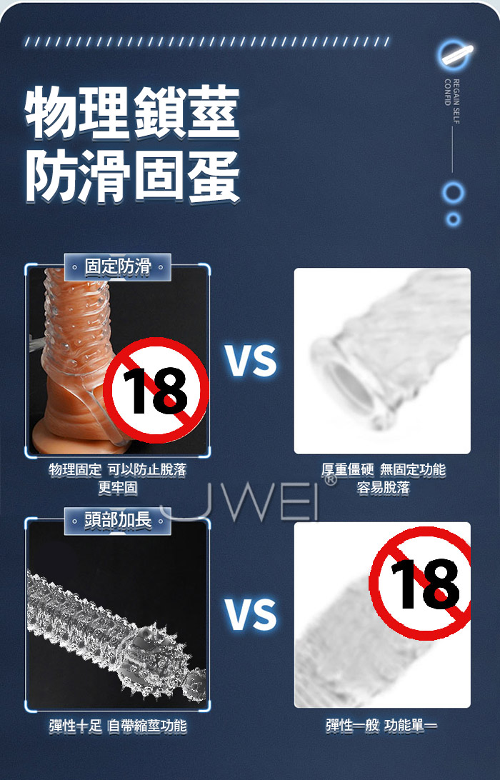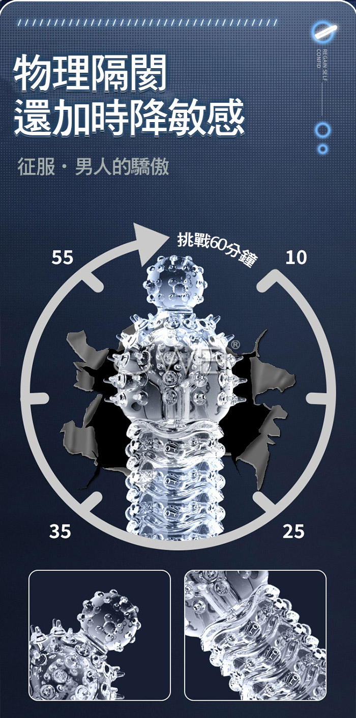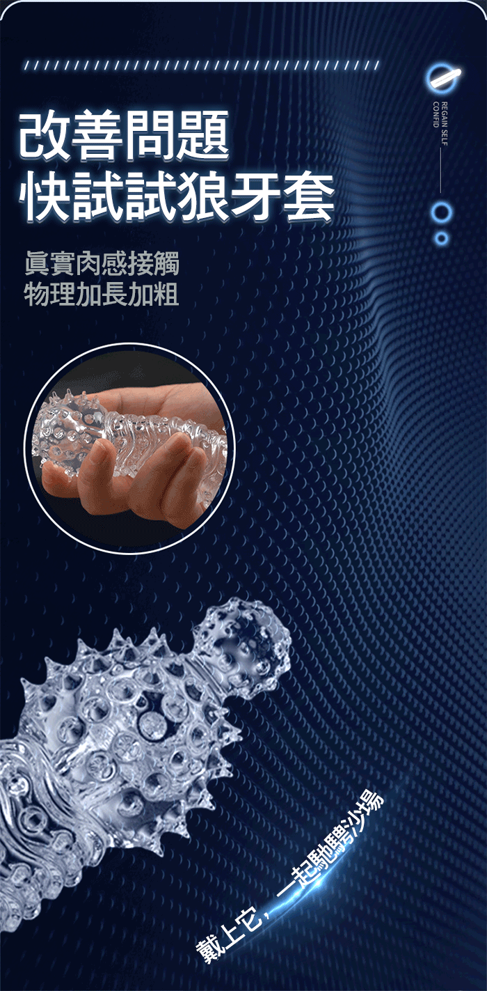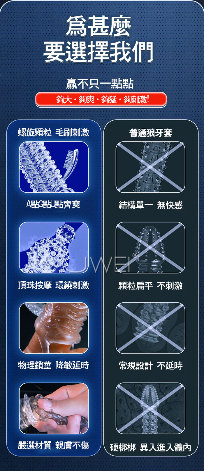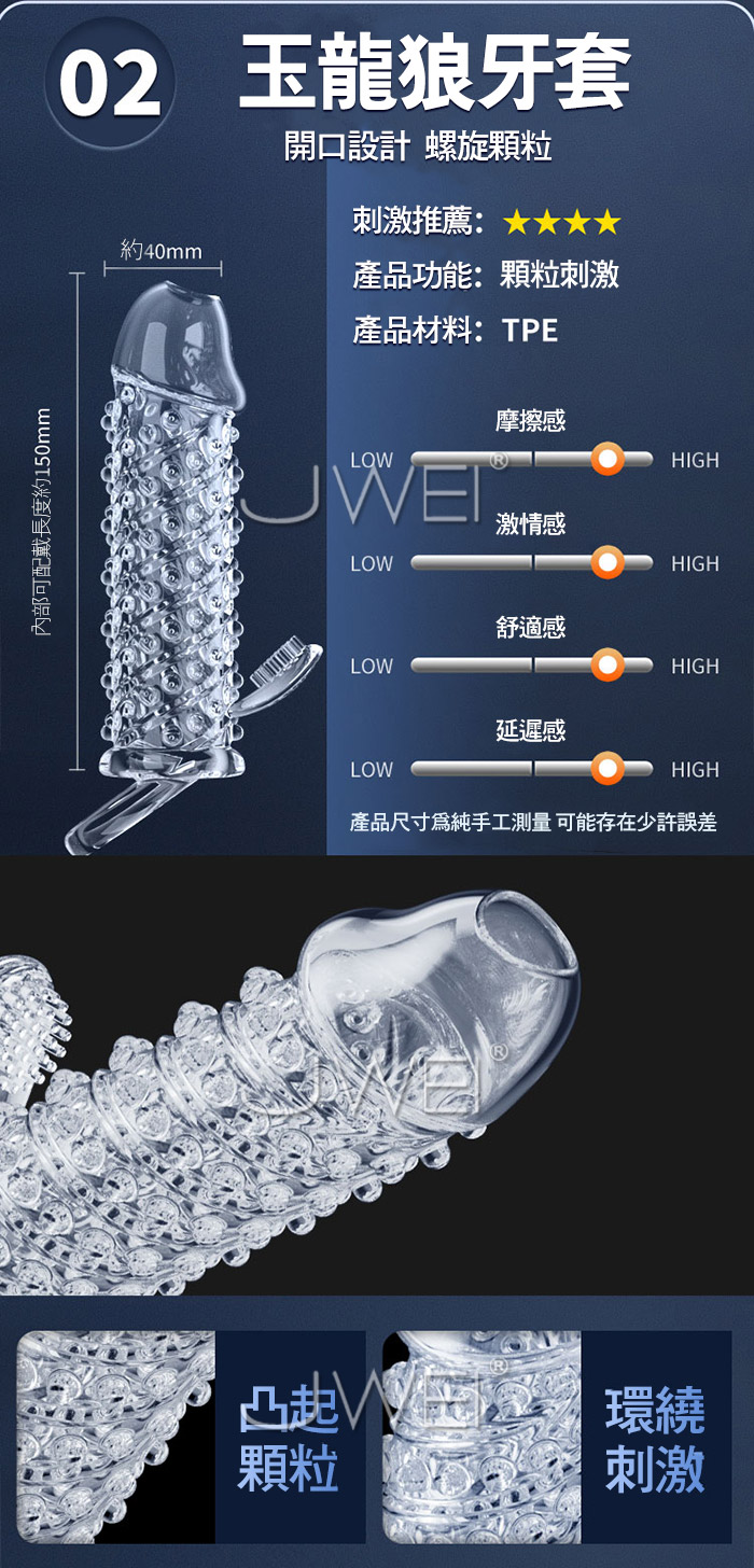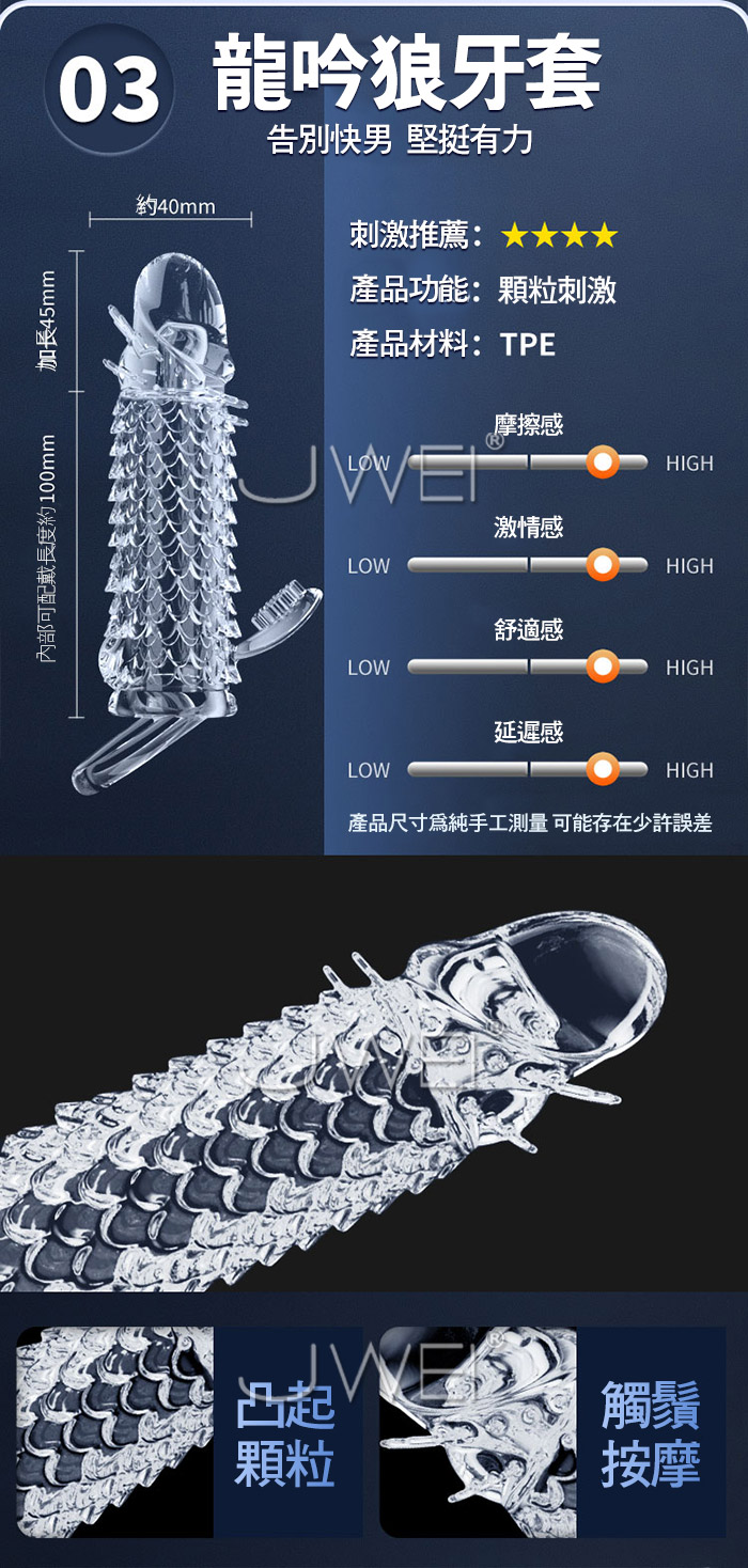 狼牙套天花板,加長加粗,大顆粒摩擦 靈珠款-頂端大肉珠刺激,增長60mm 玉龍款-凸起大顆粒,增厚6mm,前端開口設計 龍吟款-逆麟顆粒,前端按摩觸鬚,加長44mm 真實肉感接觸,物理加長加粗 夠大!夠爽!夠猛!夠刺激! ■尺寸:大小詳如圖片標示 ■材質:TPE ■功能:顆粒刺激