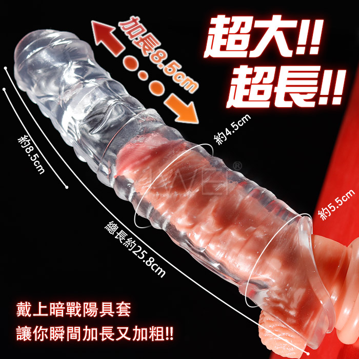 暗戰.超巨大加長8.5公分 雙層肉感刺激陽具套-透明